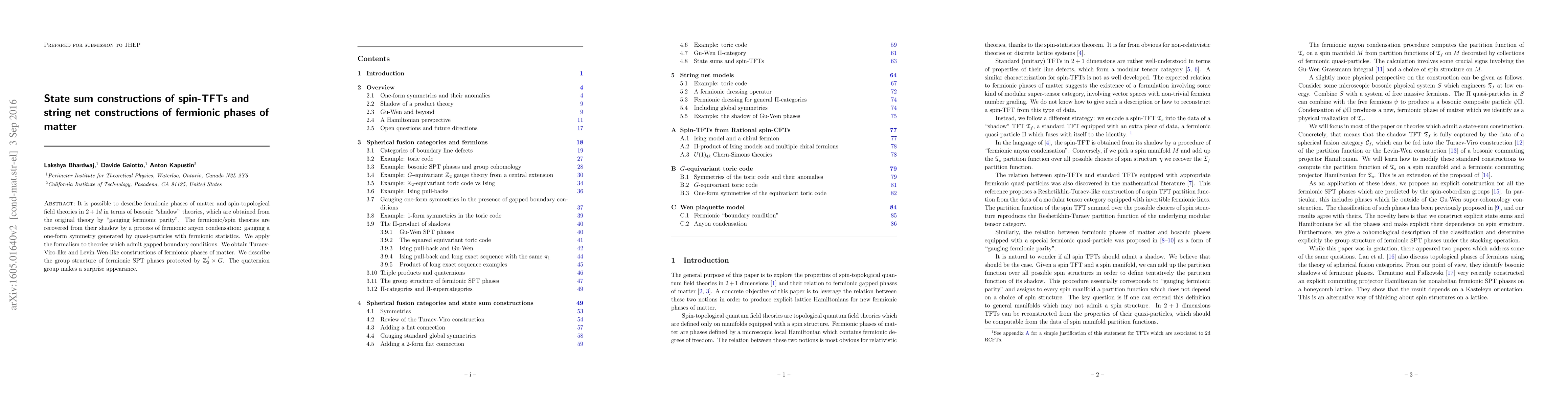 It is possible to describe fermionic phases of matter and spin-topological field theories in 2+1d in terms of bosonic "shadow" theories, which are obtained from the original theory by "gauging fermionic parity". The fermionic/spin theories are recovered from their shadow by a process of fermionic anyon condensation: gauging a one-form symmetry generated by quasi-particles with fermionic statistics. We apply the formalism to theories which admit gapped boundary conditions. We obtain Turaev-Viro-like and Levin-Wen-like constructions of fermionic phases of matter. We describe the group structure of fermionic SPT phases protected by the product of fermion parity and internal symmetry G. The quaternion group makes a surprise appearance.
