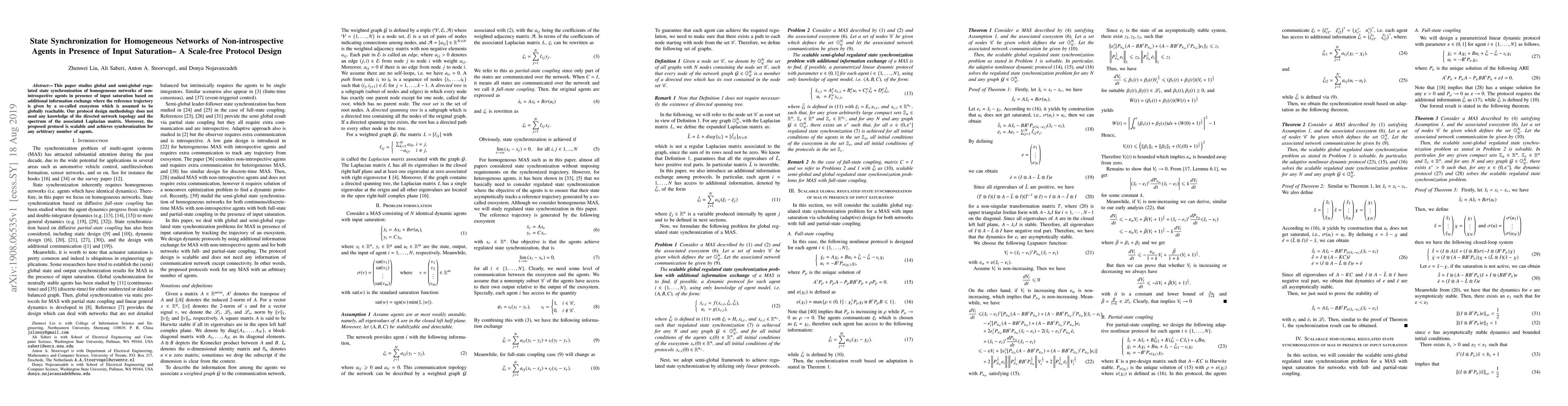 This paper proposes a scale-free protocol for achieving global and semi-global state synchronization in homogeneous networks of non-introspective agents under input saturation, without requiring knowledge of network topology. The protocol is scalable and works for any number of agents.