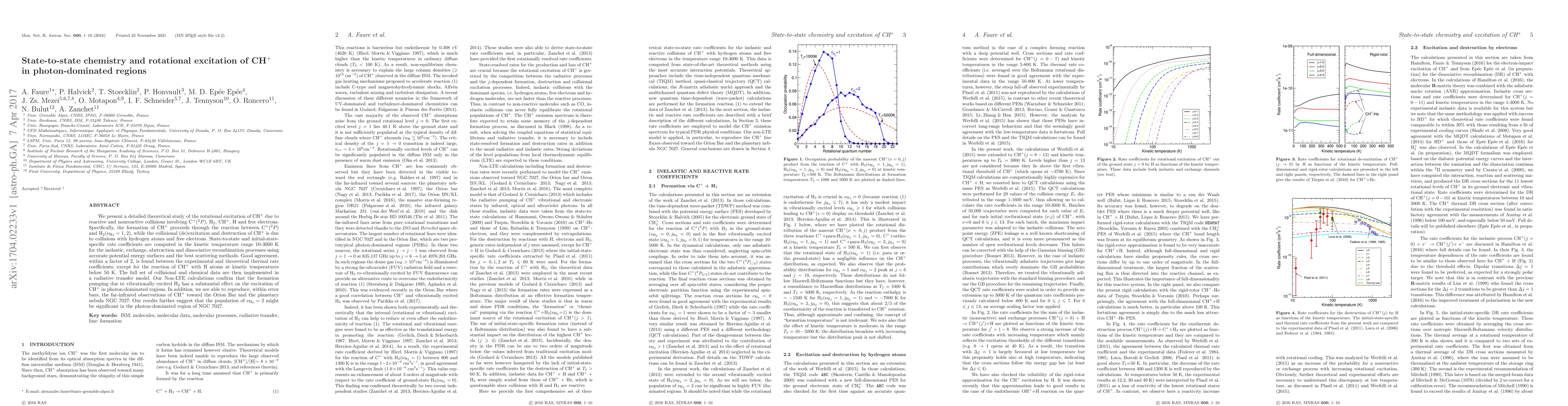 This paper presents a detailed theoretical study of the rotational excitation of CH$^+$ in photon-dominated regions, focusing on state-to-state rate coefficients for various processes. The study finds good agreement between theoretical and experimental thermal rate coefficients, except for low-temperature reactions with H atoms, and confirms the significant impact of vibrationally excited H$_2$ on CH$^+$ excitation.