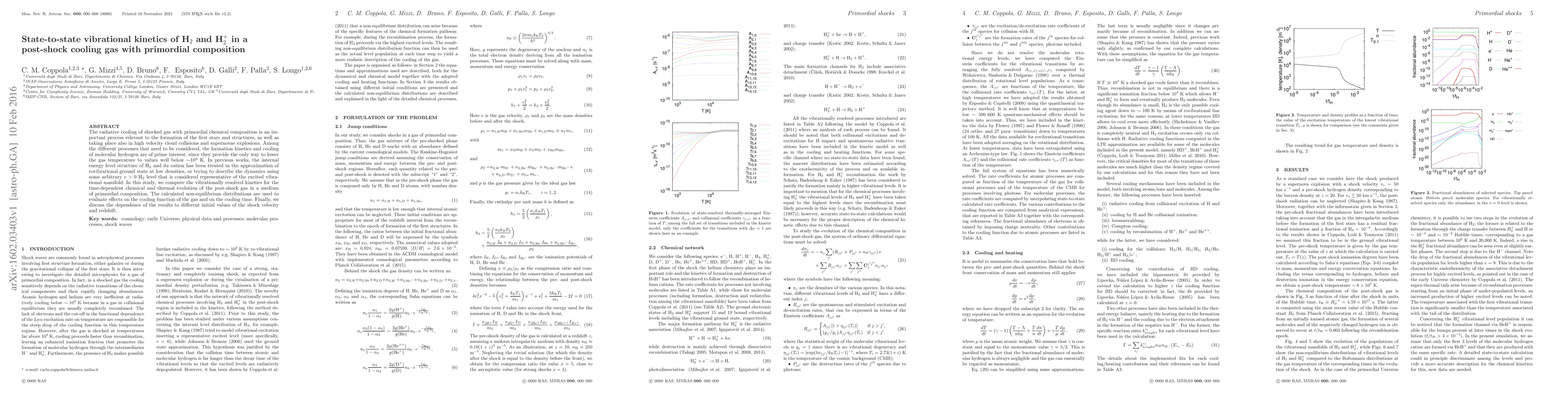 This paper investigates the state-to-state vibrational kinetics of H$_2$ and H$_2^+$ in post-shock cooling gas with primordial composition, focusing on their role in radiative cooling processes relevant to early star and structure formation. The study provides detailed vibrationally resolved kinetics to assess the impact on gas cooling functions and times, considering variations in shock velocity and redshift.