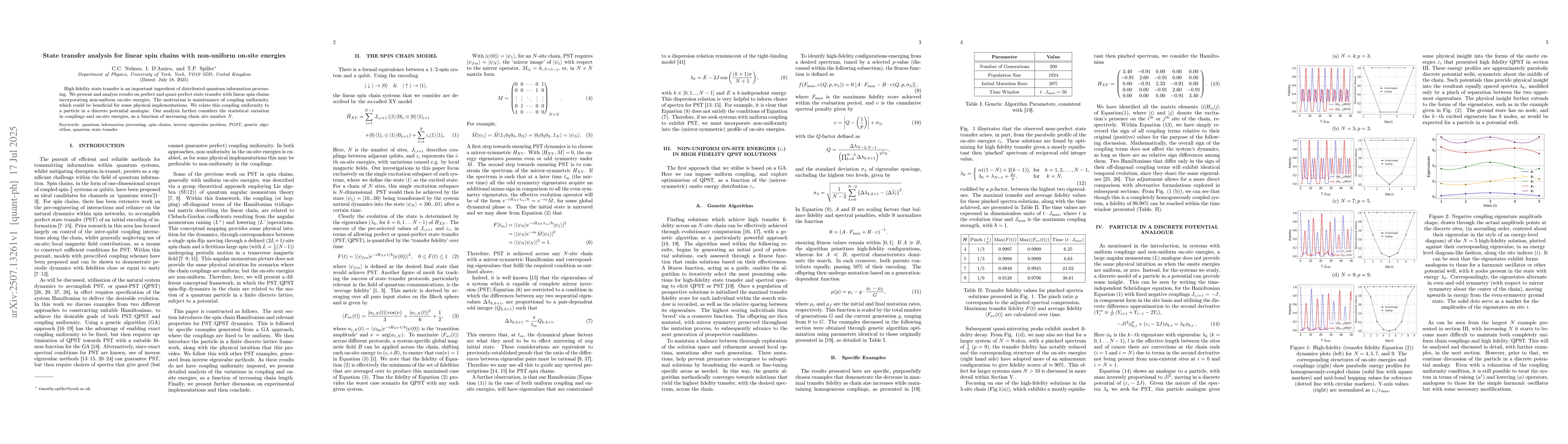High fidelity state transfer is an important ingredient of distributed quantum information processing. We present and analyse results on perfect and quasi-perfect state transfer with linear spin chains incorporating non-uniform on-site energies. The motivation is maintenance of coupling uniformity, which could be beneficial for some physical implementations. We relate this coupling uniformity to a particle in a discrete potential analogue. Our analysis further considers the statistical variation in couplings and on-site energies, as a function of increasing chain site number N.
