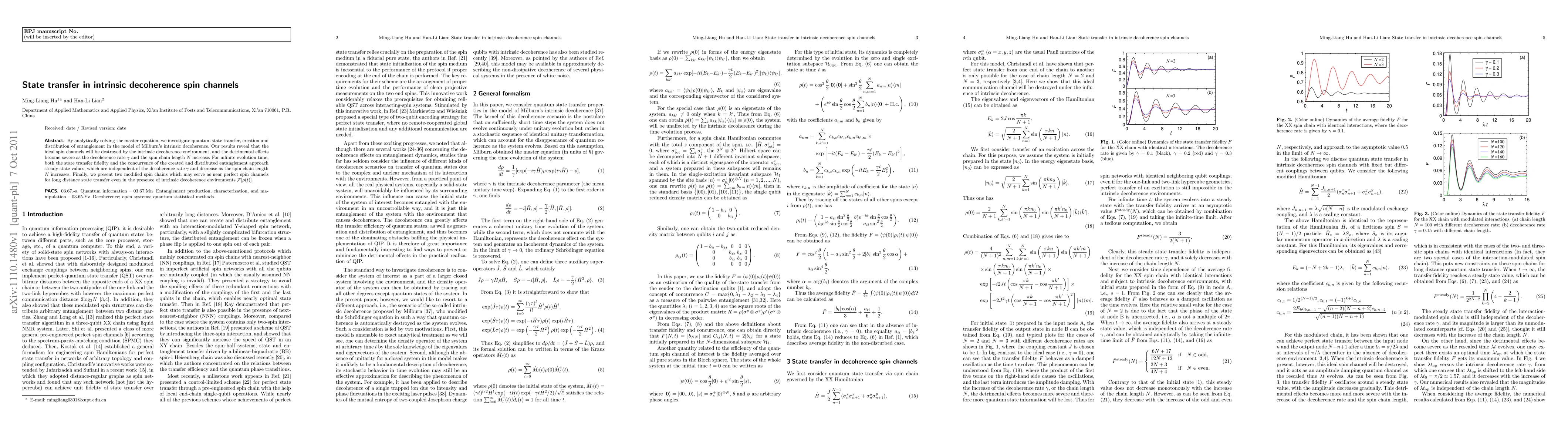 This paper investigates quantum state transfer and entanglement distribution in Milburn's intrinsic decoherence spin channels, revealing that intrinsic decoherence severely degrades ideal spin channels, especially with higher decoherence rates and longer chain lengths. It proposes two modified spin chains that maintain near-perfect state transfer fidelity despite decoherence.