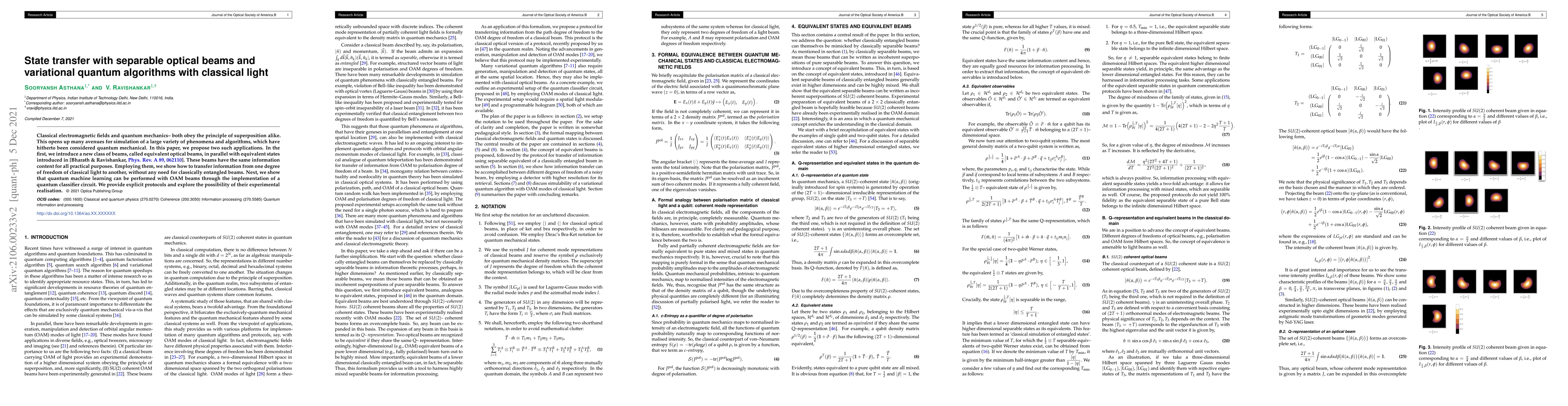 Classical electromagnetic fields and quantum mechanics -- both obey the principle of superposition alike. This opens up many avenues for simulation of a large variety of phenomena and algorithms, which have hitherto been considered quantum mechanical. In this paper, we propose two such applications. In the first, we introduce a new class of beams, called equivalent optical beams, in parallel with equivalent states introduced in [Bharath & Ravishankar, https://doi.org/10.1103/PhysRevA.89.062110]. These beams have the same information content for all practical purposes. Employing them, we show how to transfer information from one degree of freedom of classical light to another, without any need for classically entangled beams. Next, we show that quantum machine learning can be performed with OAM beams through the implementation of a quantum classifier circuit. We provide explicit protocols and explore the possibility of their experimental realization.