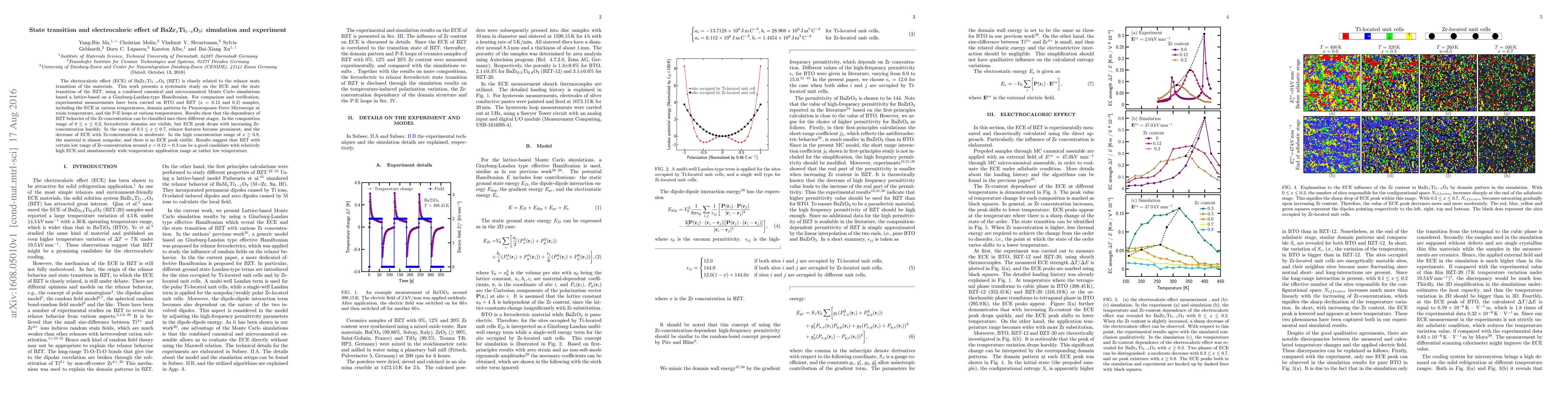 The electrocaloric effect (ECE) of BaZr$_{x}$Ti$_{1-x}$O$_3$ (BZT) is closely related to the relaxor state transition of the materials. This work presents a systematic study on the ECE and the state transition of the BZT, using a combined canonical and microcanonical Monte Carlo simulations based a lattice-based on a Ginzburg-Landau-type Hamiltonian. For comparison and verification, experimental measurements have been carried on BTO and BZT ($x=0.12$ and $0.2$) samples, including the ECE at various temperatures, domain patterns by Piezoresponse Force Microscopy at room temperature, and the P-E loops at various temperatures. Results show that the dependency of BZT behavior of the Zr-concentration can be classified into three different stages. In the composition range of $ 0 \leq x \leq 0.2 $, ferroelectric domains are visible, but ECE peak drops with increasing Zr-concentration harshly. In the range of $ 0.3 \leq x \leq 0.7 $, relaxor features become prominent, and the decrease of ECE with Zr-concentration is moderate. In the high concentration range of $ x \geq 0.8 $, the material is almost nonpolar, and there is no ECE peak visible. Results suggest that BZT with certain low range of Zr-concentration around $x=0.12 \sim 0.3 $ can be a good candidate with relatively high ECE and simutaneously wide temperature application range at rather low temperature.