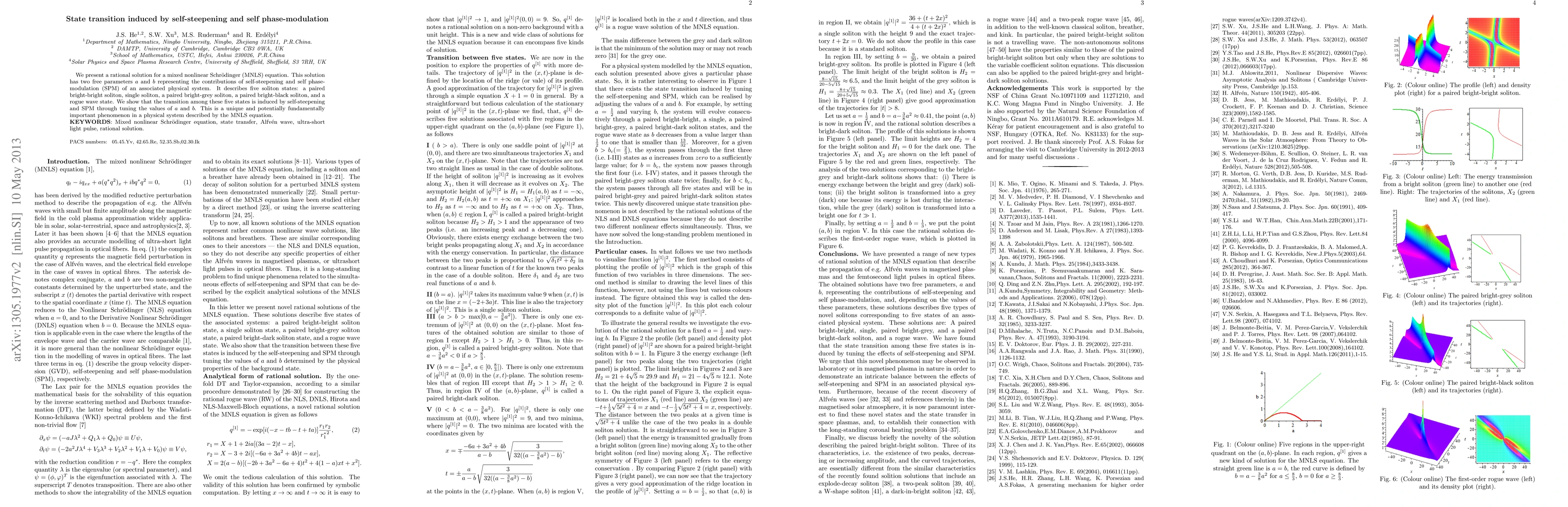 We present a rational solution for a mixed nonlinear Schr\"odinger (MNLS) equation. This solution has two free parameters $a$ and $b$ representing the contributions of self-steepening and self phase-modulation (SPM) of an associated physical system. It describes five soliton states: a paired bright-bright soliton, single soliton, a paired bright-grey soliton, a paired bright-black soliton, and a rogue wave state. We show that the transition among these five states is induced by self-steepening and SPM through tuning the values of $a$ and $b$. This is a unique and potentially fundamentally important phenomenon in a physical system described by the MNLS equation.