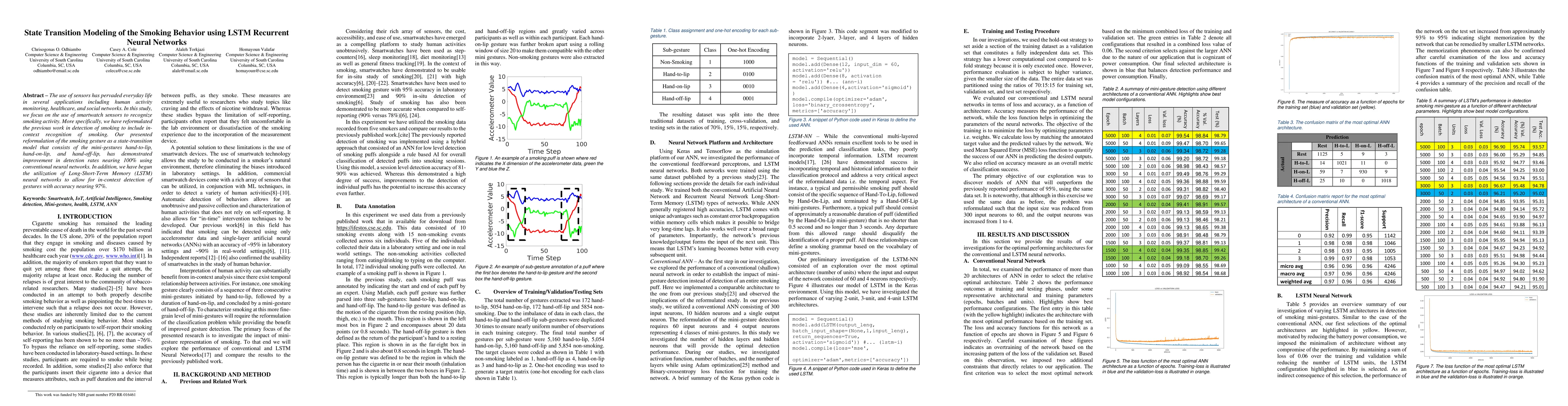 The use of sensors has pervaded everyday life in several applications including human activity monitoring, healthcare, and social networks. In this study, we focus on the use of smartwatch sensors to recognize smoking activity. More specifically, we have reformulated the previous work in detection of smoking to include in-context recognition of smoking. Our presented reformulation of the smoking gesture as a state-transition model that consists of the mini-gestures hand-to-lip, hand-on-lip, and hand-off-lip, has demonstrated improvement in detection rates nearing 100% using conventional neural networks. In addition, we have begun the utilization of Long-Short-Term Memory (LSTM) neural networks to allow for in-context detection of gestures with accuracy nearing 97%.