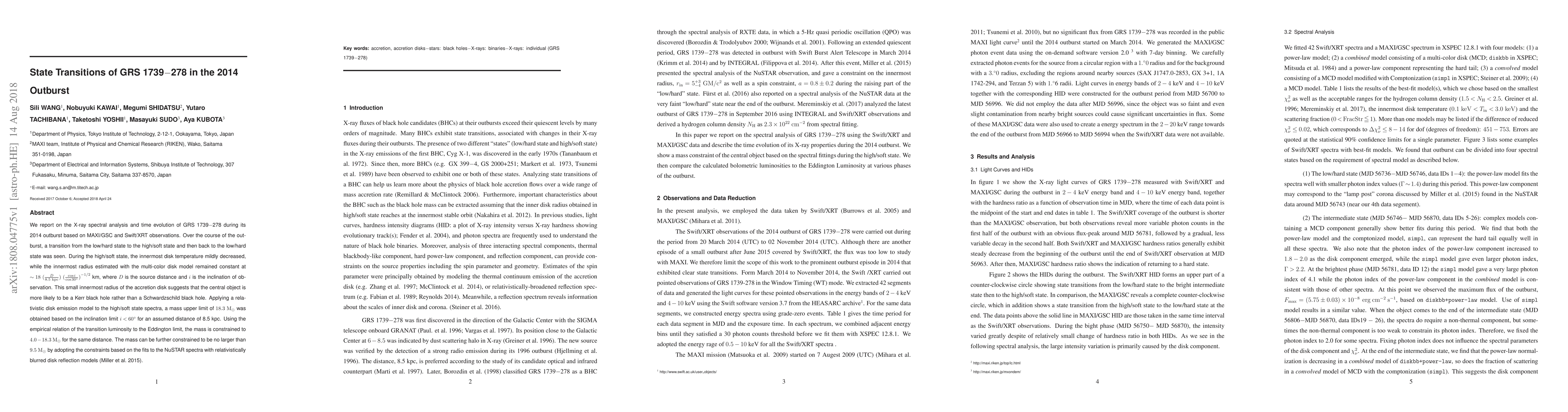 We report on the X-ray spectral analysis and time evolution of GRS 1739$-$278 during its 2014 outburst based on MAXI/GSC and Swift/XRT observations. Over the course of the outburst, a transition from the low/hard state to the high/soft state and then back to the low/hard state was seen. During the high/soft state, the innermost disk temperature mildly decreased, while the innermost radius estimated with the multi-color disk model remained constant at $\sim18\ (\frac{D}{8.5\ \mathrm{kpc}}) \ {(\frac{\cos i}{\cos 30^{\circ}})}^{-1/2}$ km, where $D$ is the source distance and $i$ is the inclination of observation. This small innermost radius of the accretion disk suggests that the central object is more likely to be a Kerr black hole rather than a Schwardzschild black hole. Applying a relativistic disk emission model to the high/soft state spectra, a mass upper limit of $18.3\ \mathrm{M_{\odot}}$ was obtained based on the inclination limit $i<60^{\circ}$ for an assumed distance of 8.5 kpc. Using the empirical relation of the transition luminosity to the Eddington limit, the mass is constrained to $4.0-18.3\ \mathrm{M_{\odot}}$ for the same distance. The mass can be further constrained to be no larger than $9.5\ \mathrm{M_{\odot}}$ by adopting the constraints based on the fits to the NuSTAR spectra with relativistically blurred disk reflection models (Miller et al. 2015).