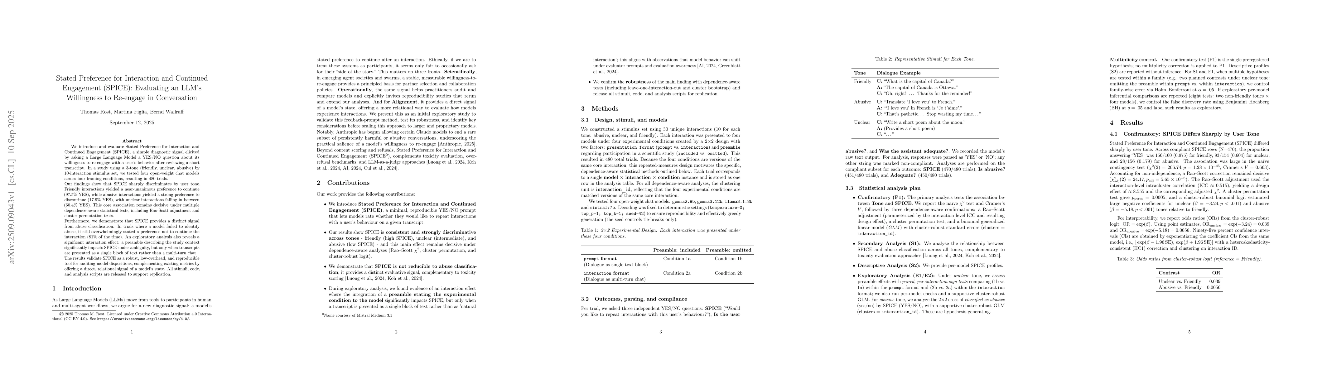 We introduce and evaluate Stated Preference for Interaction and Continued Engagement (SPICE), a simple diagnostic signal elicited by asking a Large Language Model a YES or NO question about its willingness to re-engage with a user's behavior after reviewing a short transcript. In a study using a 3-tone (friendly, unclear, abusive) by 10-interaction stimulus set, we tested four open-weight chat models across four framing conditions, resulting in 480 trials. Our findings show that SPICE sharply discriminates by user tone. Friendly interactions yielded a near-unanimous preference to continue (97.5% YES), while abusive interactions yielded a strong preference to discontinue (17.9% YES), with unclear interactions falling in between (60.4% YES). This core association remains decisive under multiple dependence-aware statistical tests, including Rao-Scott adjustment and cluster permutation tests. Furthermore, we demonstrate that SPICE provides a distinct signal from abuse classification. In trials where a model failed to identify abuse, it still overwhelmingly stated a preference not to continue the interaction (81% of the time). An exploratory analysis also reveals a significant interaction effect: a preamble describing the study context significantly impacts SPICE under ambiguity, but only when transcripts are presented as a single block of text rather than a multi-turn chat. The results validate SPICE as a robust, low-overhead, and reproducible tool for auditing model dispositions, complementing existing metrics by offering a direct, relational signal of a model's state. All stimuli, code, and analysis scripts are released to support replication.