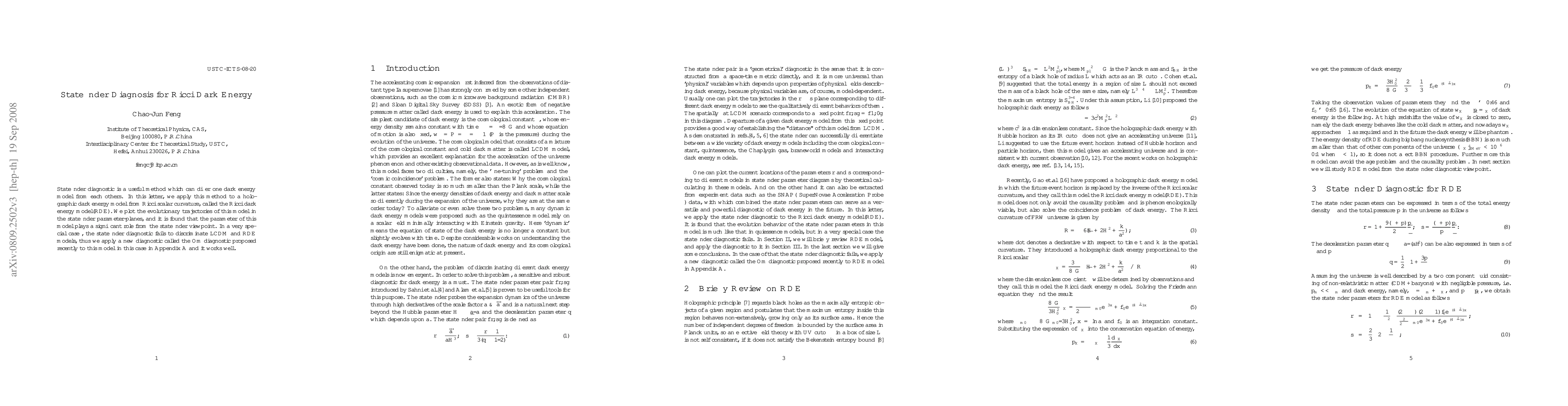This paper applies the statefinder diagnostic to the Ricci dark energy model derived from Ricci scalar curvature, finding that the model's parameters significantly influence its trajectory in statefinder parameter-planes. When statefinder fails to distinguish it from the ΛCDM model, the Om diagnostic is used successfully as an alternative.