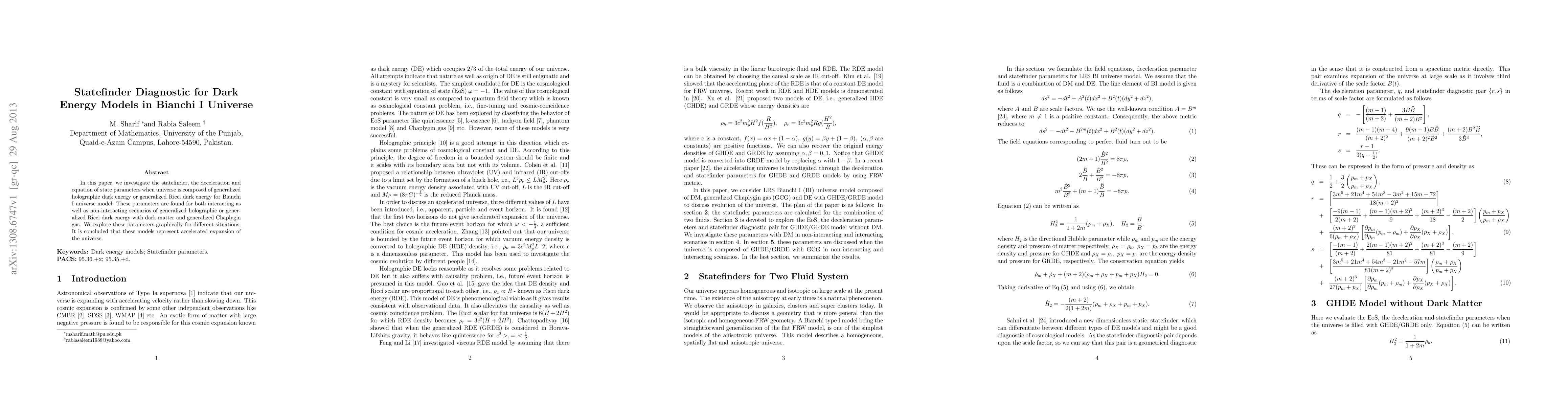 This paper examines the statefinder, deceleration, and equation of state parameters for dark energy models in a Bianchi I universe, specifically for generalized holographic and Ricci dark energies. The study finds that these models indicate an accelerated expansion of the universe, both in interacting and non-interacting scenarios with dark matter and Chaplygin gas.