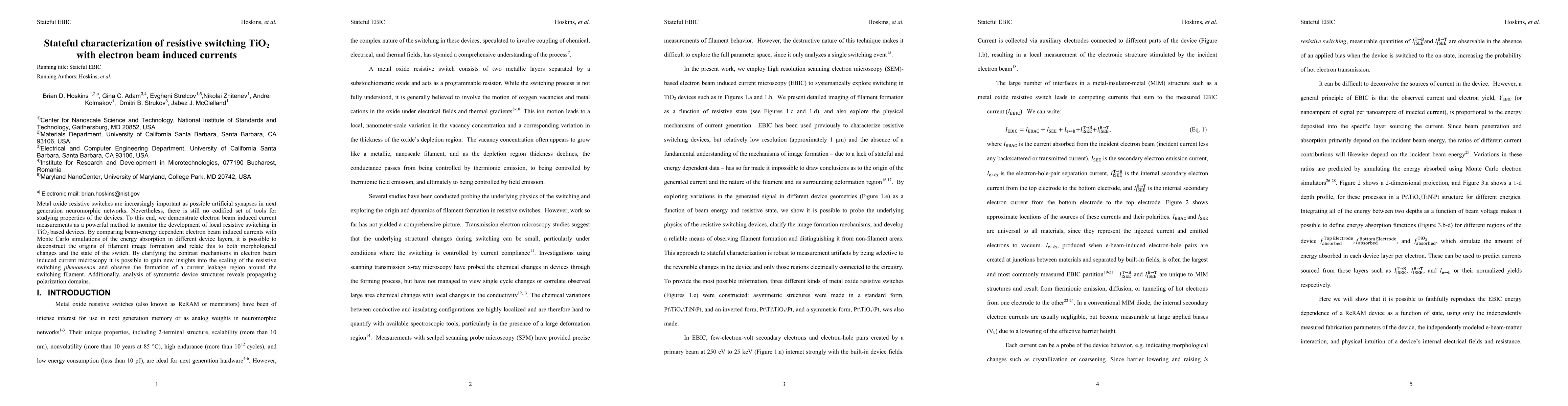 Metal oxide resistive switches are increasingly important as possible artificial synapses in next generation neuromorphic networks. Nevertheless, there is still no codified set of tools for studying properties of the devices. To this end, we demonstrate electron beam induced current measurements as a powerful method to monitor the development of local resistive switching in TiO2 based devices. By comparing beam-energy dependent electron beam induced currents with Monte Carlo simulations of the energy absorption in different device layers, it is possible to deconstruct the origins of filament image formation and relate this to both morphological changes and the state of the switch. By clarifying the contrast mechanisms in electron beam induced current microscopy it is possible to gain new insights into the scaling of the resistive switching phenomenon and observe the formation of a current leakage region around the switching filament. Additionally, analysis of symmetric device structures reveals propagating polarization domains.