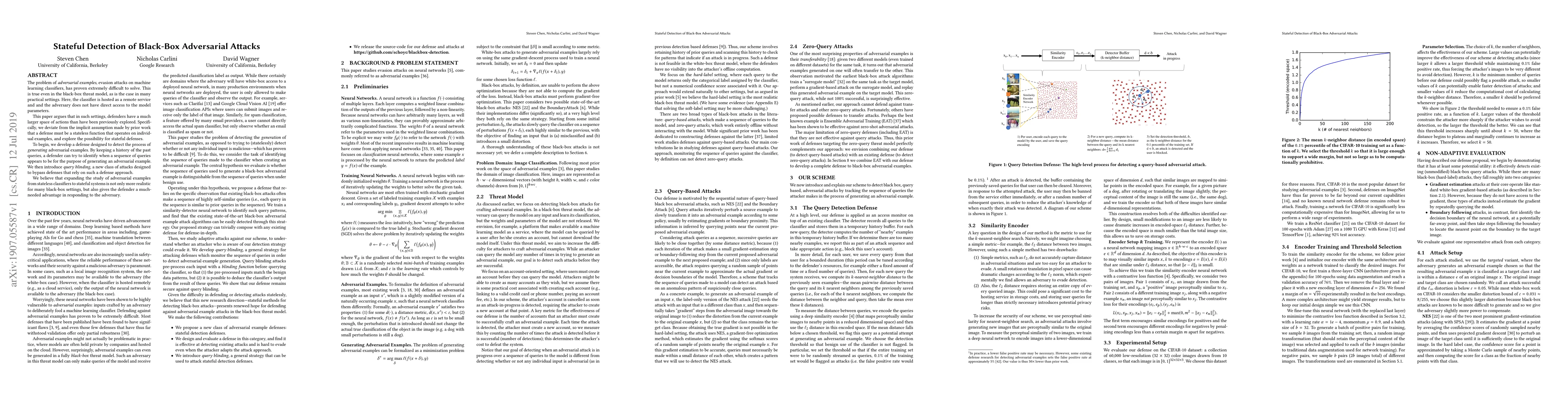 The problem of adversarial examples, evasion attacks on machine learning classifiers, has proven extremely difficult to solve. This is true even when, as is the case in many practical settings, the classifier is hosted as a remote service and so the adversary does not have direct access to the model parameters. This paper argues that in such settings, defenders have a much larger space of actions than have been previously explored. Specifically, we deviate from the implicit assumption made by prior work that a defense must be a stateless function that operates on individual examples, and explore the possibility for stateful defenses. To begin, we develop a defense designed to detect the process of adversarial example generation. By keeping a history of the past queries, a defender can try to identify when a sequence of queries appears to be for the purpose of generating an adversarial example. We then introduce query blinding, a new class of attacks designed to bypass defenses that rely on such a defense approach. We believe that expanding the study of adversarial examples from stateless classifiers to stateful systems is not only more realistic for many black-box settings, but also gives the defender a much-needed advantage in responding to the adversary.