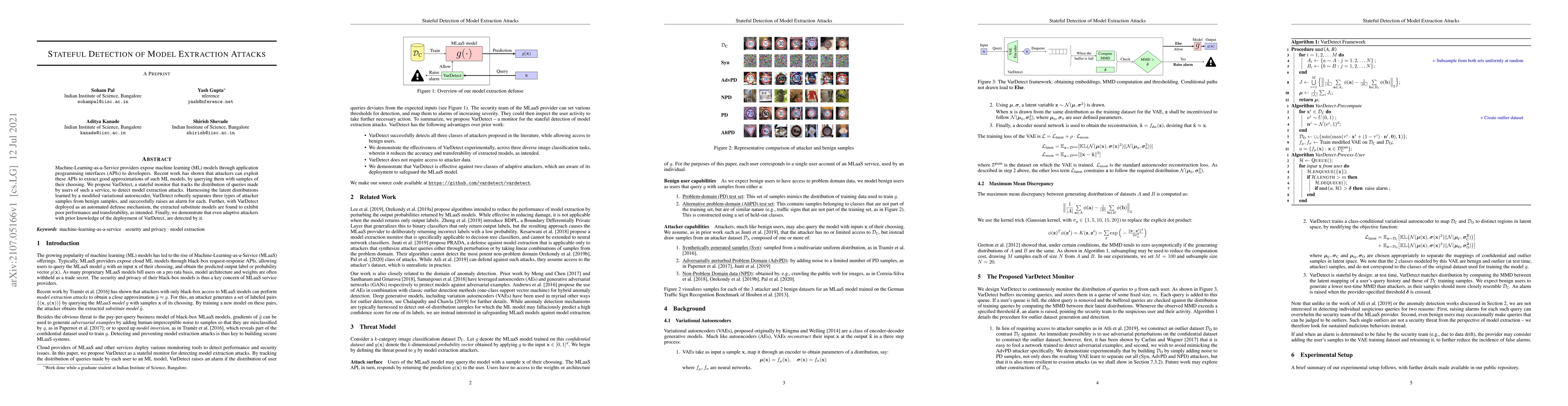 Machine-Learning-as-a-Service providers expose machine learning (ML) models through application programming interfaces (APIs) to developers. Recent work has shown that attackers can exploit these APIs to extract good approximations of such ML models, by querying them with samples of their choosing. We propose VarDetect, a stateful monitor that tracks the distribution of queries made by users of such a service, to detect model extraction attacks. Harnessing the latent distributions learned by a modified variational autoencoder, VarDetect robustly separates three types of attacker samples from benign samples, and successfully raises an alarm for each. Further, with VarDetect deployed as an automated defense mechanism, the extracted substitute models are found to exhibit poor performance and transferability, as intended. Finally, we demonstrate that even adaptive attackers with prior knowledge of the deployment of VarDetect, are detected by it.