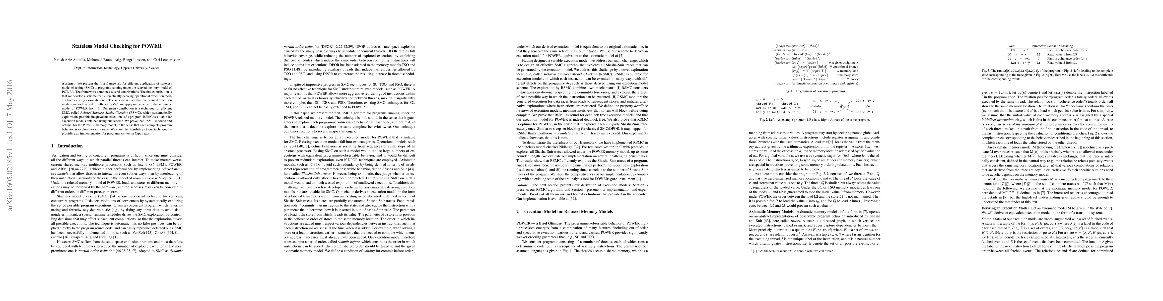 This paper introduces a framework for applying stateless model checking (SMC) to programs under the POWER memory model, developing a method for deriving efficient execution models and presenting Relaxed Stateless Model Checking (RSMC) to explore inequivalent program executions. RSMC is proven sound and optimal for the POWER model, demonstrated through an implementation for C/pthreads programs.