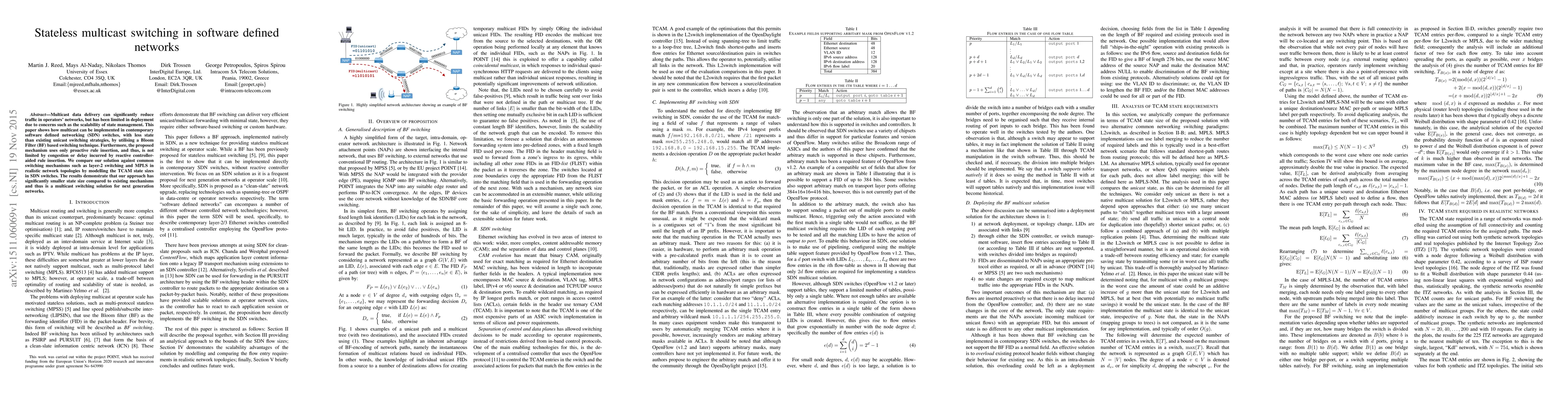 This paper proposes a stateless multicast switching technique in SDN using Bloom Filter-based switching, which requires less state than unicast methods and avoids congestion through proactive rule insertion. Comparative analysis shows that this approach significantly reduces TCAM state size compared to traditional layer-2 switching and MPLS, making it a viable solution for next-generation networks.