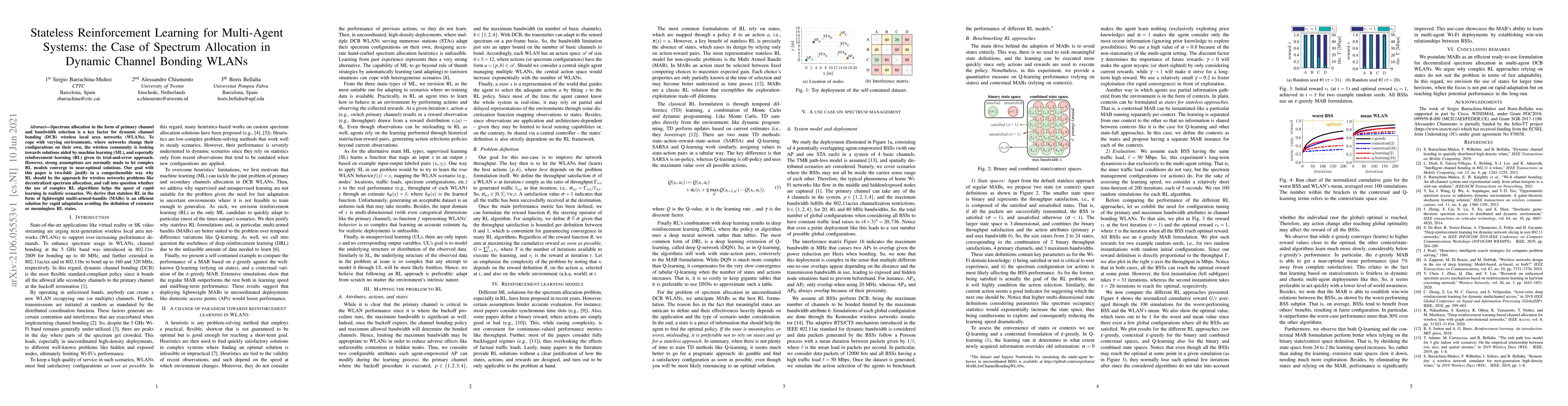 This paper explores the use of stateless reinforcement learning, specifically lightweight multi-armed bandits, for decentralized spectrum allocation in dynamic channel bonding WLANs. It argues that traditional complex RL algorithms may not be necessary for rapid learning in realistic scenarios and proposes a simpler approach for efficient adaptation.