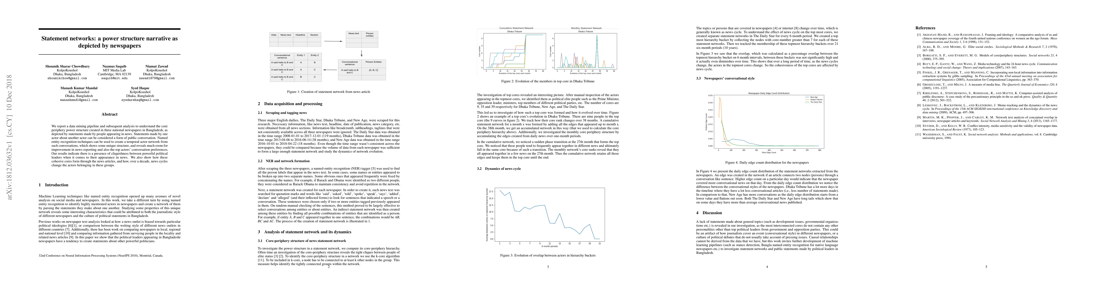 We report a data mining pipeline and subsequent analysis to understand the core periphery power structure created in three national newspapers in Bangladesh, as depicted by statements made by people appearing in news. Statements made by one actor about another actor can be considered a form of public conversation. Named entity recognition techniques can be used to create a temporal actor network from such conversations, which shows some unique structure, and reveals much room for improvement in news reporting and also the top actors' conversation preferences. Our results indicate there is a presence of cliquishness between powerful political leaders when it comes to their appearance in news. We also show how these cohesive cores form through the news articles, and how, over a decade, news cycles change the actors belonging in these groups.