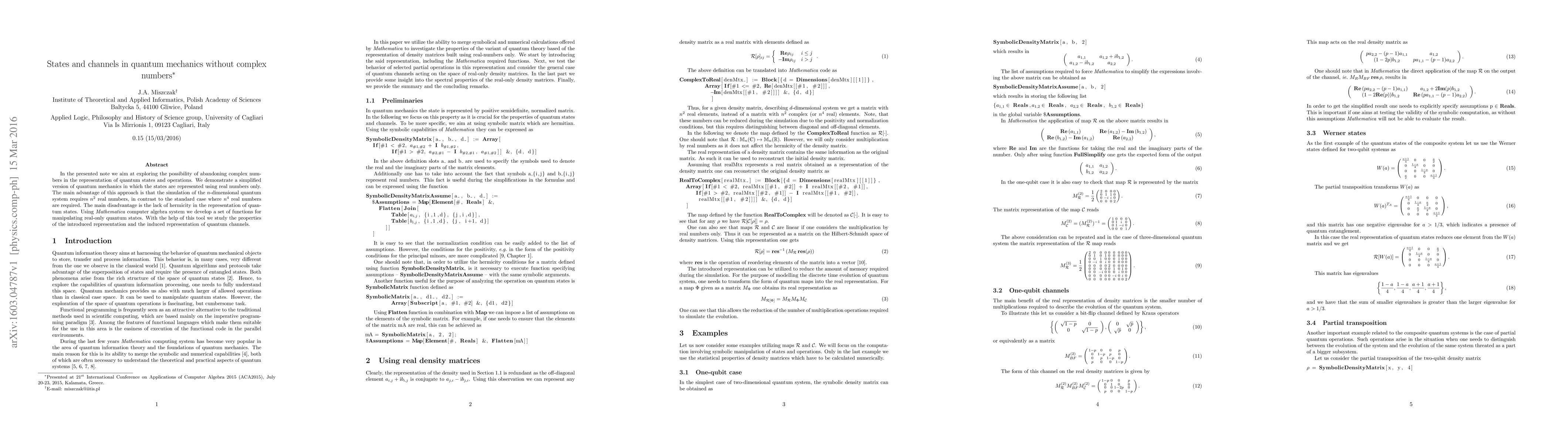 Researchers propose a simplified version of quantum mechanics using only real numbers to represent states, reducing computational requirements but sacrificing hermicity, and develop tools for manipulating these states in Mathematica.