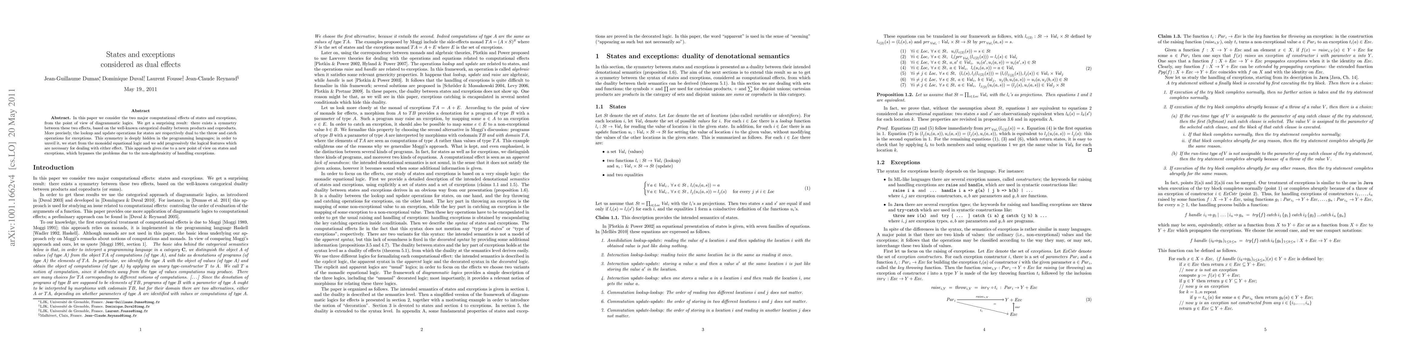 In this paper we consider the two major computational effects of states and exceptions, from the point of view of diagrammatic logics. We get a surprising result: there exists a symmetry between these two effects, based on the well-known categorical duality between products and coproducts. More precisely, the lookup and update operations for states are respectively dual to the throw and catch operations for exceptions. This symmetry is deeply hidden in the programming languages; in order to unveil it, we start from the monoidal equational logic and we add progressively the logical features which are necessary for dealing with either effect. This approach gives rise to a new point of view on states and exceptions, which bypasses the problems due to the non-algebraicity of handling exceptions.