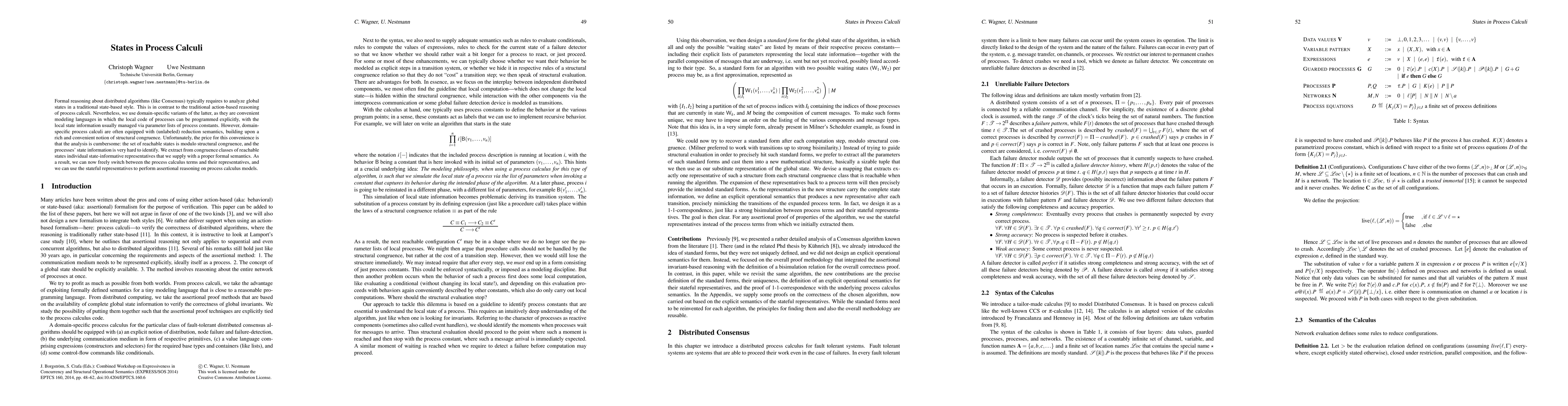 Formal reasoning about distributed algorithms (like Consensus) typically requires to analyze global states in a traditional state-based style. This is in contrast to the traditional action-based reasoning of process calculi. Nevertheless, we use domain-specific variants of the latter, as they are convenient modeling languages in which the local code of processes can be programmed explicitly, with the local state information usually managed via parameter lists of process constants. However, domain-specific process calculi are often equipped with (unlabeled) reduction semantics, building upon a rich and convenient notion of structural congruence. Unfortunately, the price for this convenience is that the analysis is cumbersome: the set of reachable states is modulo structural congruence, and the processes' state information is very hard to identify. We extract from congruence classes of reachable states individual state-informative representatives that we supply with a proper formal semantics. As a result, we can now freely switch between the process calculus terms and their representatives, and we can use the stateful representatives to perform assertional reasoning on process calculus models.