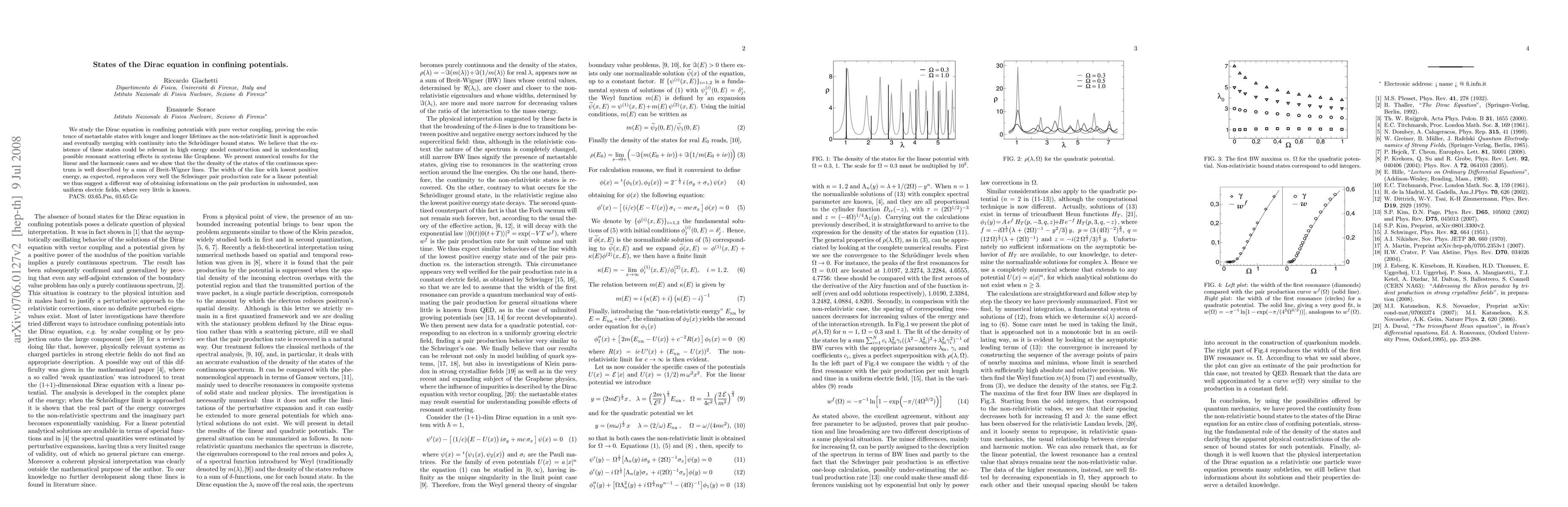 This paper investigates the Dirac equation under confining potentials, demonstrating the existence of metastable states that transition into Schrödinger bound states as the non-relativistic limit is approached. The study suggests these states may be significant in high energy models and resonant scattering phenomena, with numerical results supporting the description of continuous spectrum density by Breit-Wigner lines.