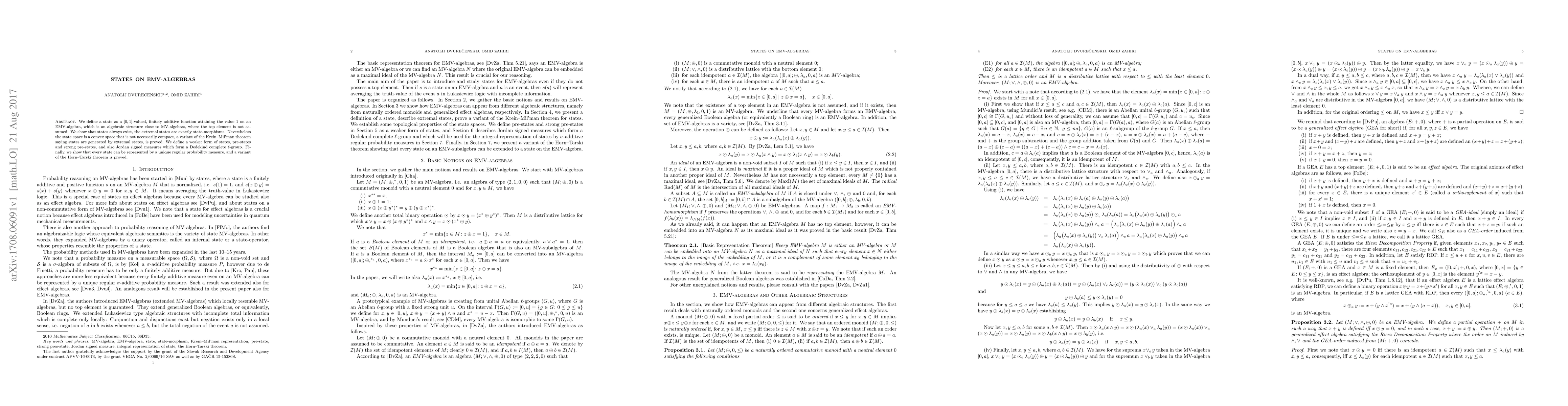 This paper explores the concept of states on EMV-algebras, showing their existence and connection to extremal state-morphisms. It also introduces pre-states, strong pre-states, and Jordan signed measures, ultimately proving a representation theorem for states by regular probability measures and a variant of the Horn-Tarski theorem.