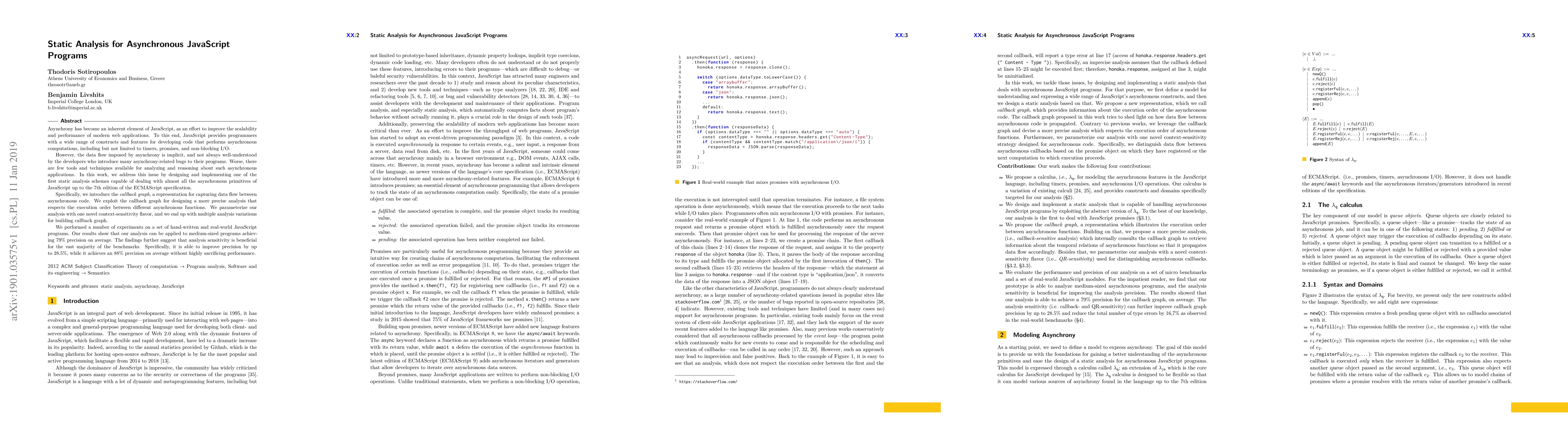 This paper presents a novel static analysis scheme for asynchronous JavaScript programs, utilizing a callback graph to capture data flow and execution order. Experiments on various JavaScript programs demonstrate the analysis's precision, achieving 79% on average, and show that context-sensitivity can improve precision by up to 28.5% without significantly impacting performance.