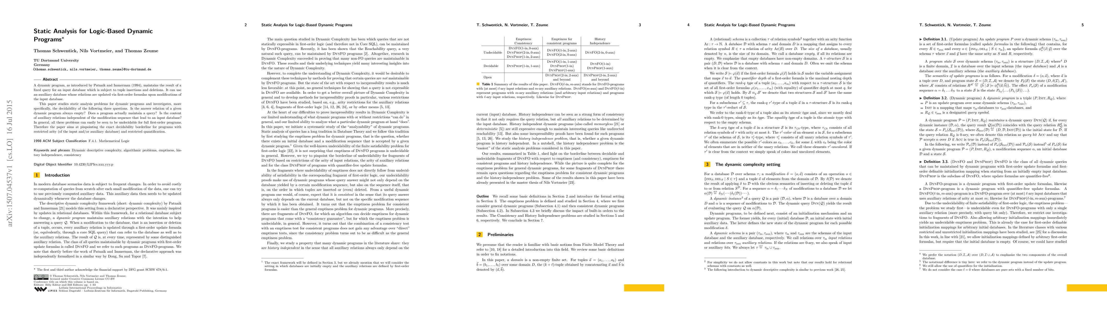 This paper examines static analysis for logic-based dynamic programs, focusing on decidability questions regarding whether the answer relation is always empty, if the program maintains a query, and if auxiliary relations are independent of modification sequences. It aims to determine the decidability boundary for programs with restricted arity and quantification.