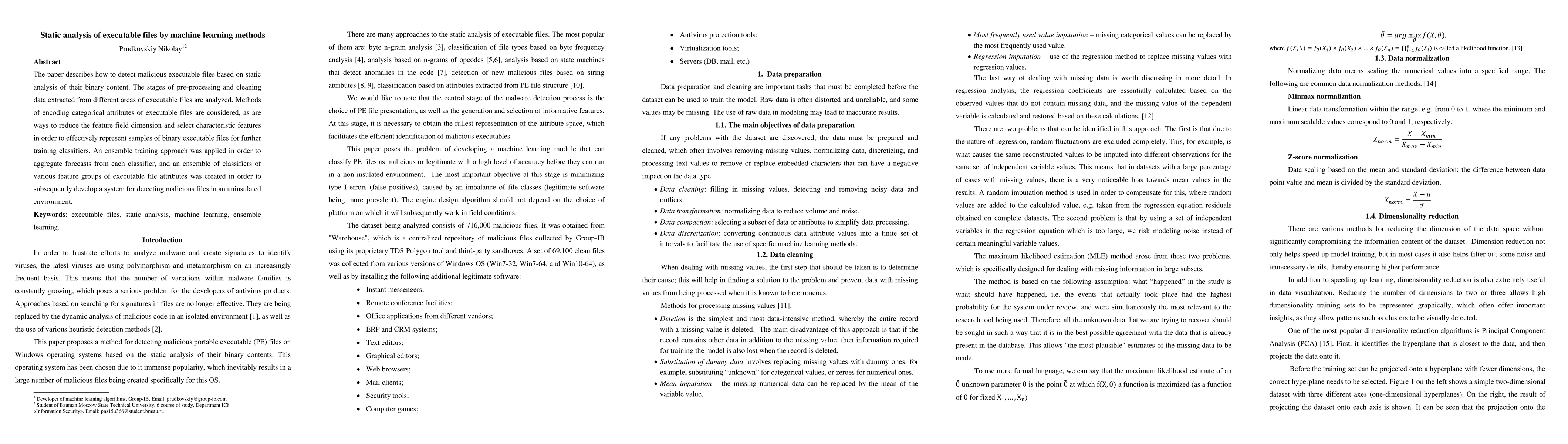 This paper explores the use of machine learning techniques for static analysis of executable files to detect malicious binaries. It details pre-processing and feature selection methods, and employs an ensemble classifier approach to improve the detection of malicious files in real-world environments.