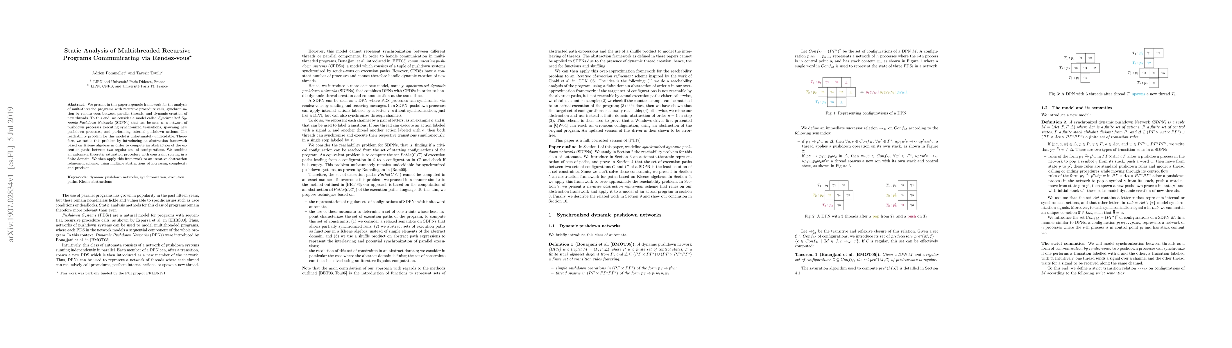 This paper introduces a framework for analyzing multi-threaded programs with recursive calls and rendez-vous synchronization, using Synchronized Dynamic Pushdown Networks (SDPNs). Despite undecidability of the reachability problem, the authors propose an abstraction method combining automata theory and constraint solving to create an iterative refinement scheme for handling complexity and precision in execution path analysis.