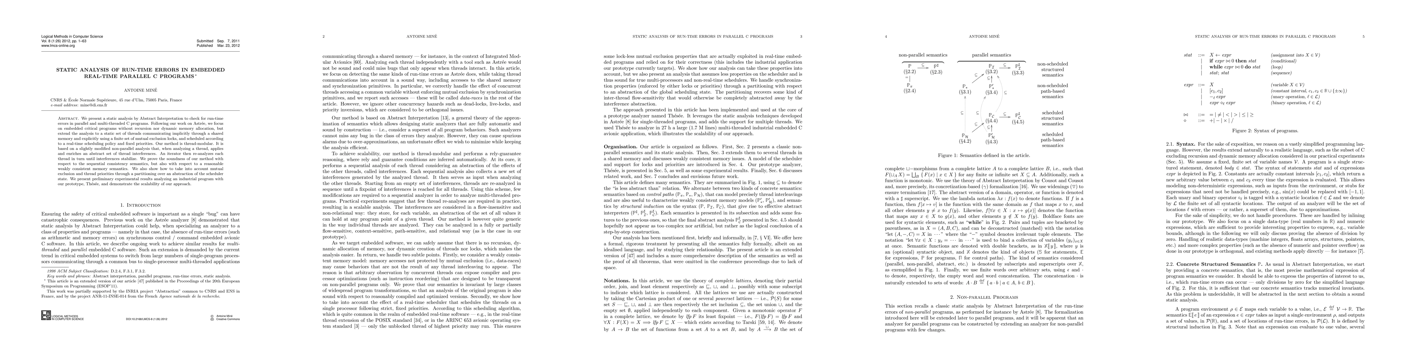 This paper presents a static analysis method using Abstract Interpretation to detect run-time errors in parallel C programs, focusing on embedded real-time systems. The method is thread-modular and scalable, demonstrated through preliminary results on an industrial program using the Th\'es\'ee prototype.