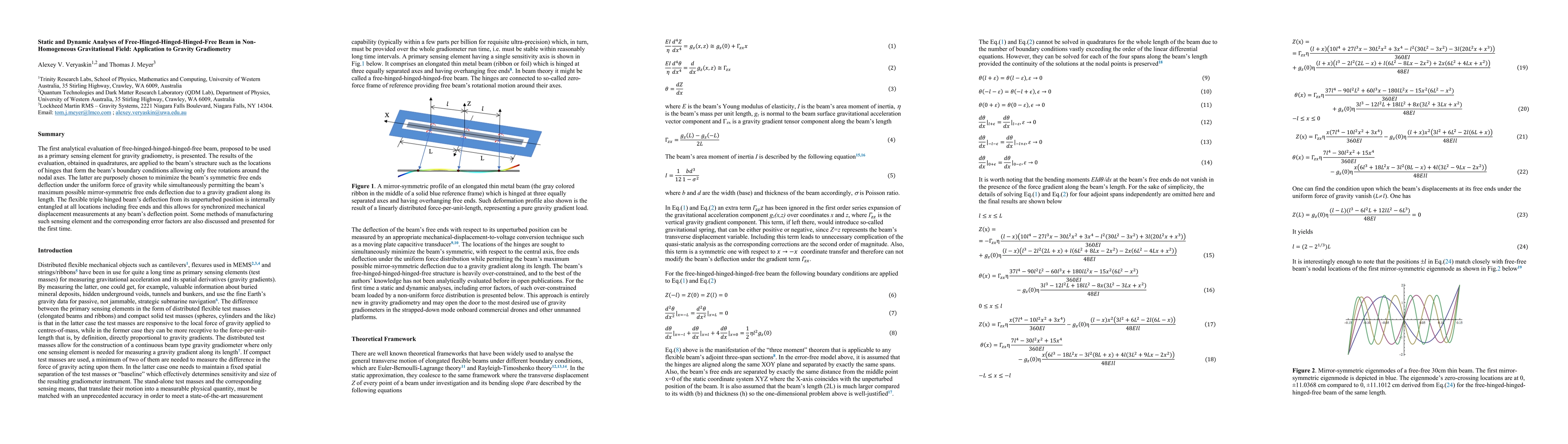 This paper presents the first analytical evaluation of a free-hinged-hinged-hinged-free beam designed for gravity gradiometry, optimizing its structure to minimize deflection under uniform gravity while maximizing deflection due to gravity gradients. The study also discusses manufacturing methods and associated error factors for this novel sensing element.