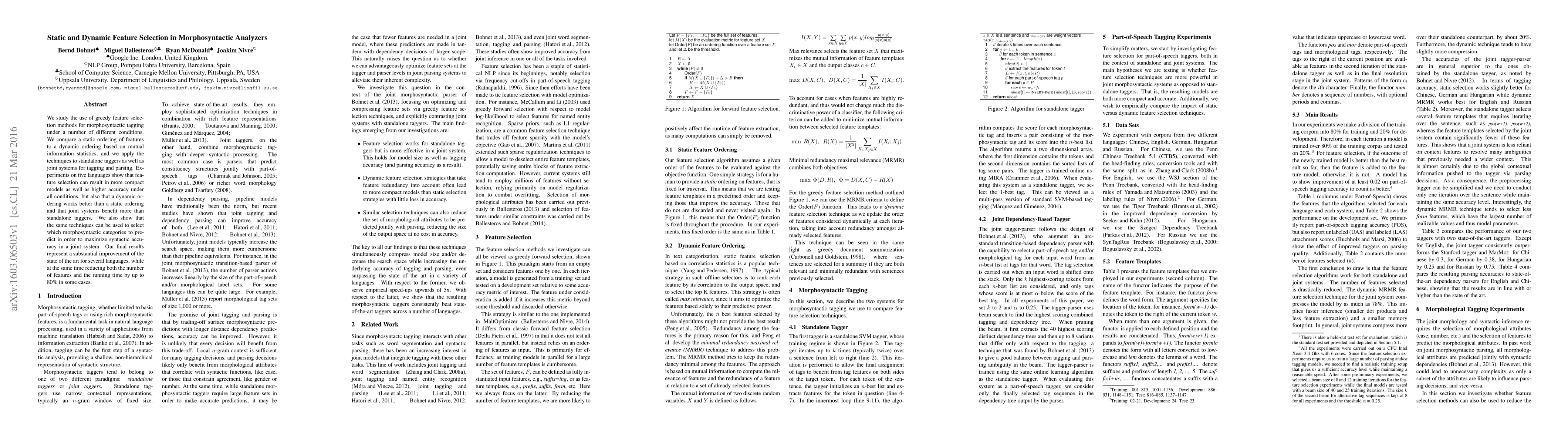 This paper investigates greedy feature selection methods for morphosyntactic tagging, comparing static and dynamic feature orderings based on mutual information. Results show that dynamic orderings and joint tagging-parsing systems outperform static methods and standalone taggers, leading to more compact models and up to an 80% reduction in features and runtime.