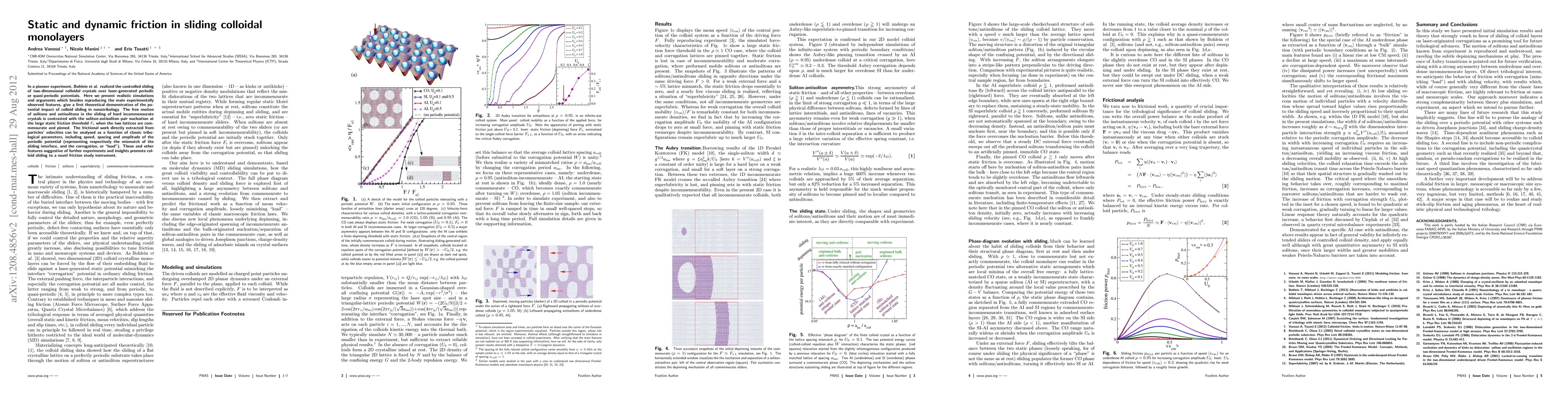 This paper presents simulations demonstrating the static and dynamic friction in sliding colloidal monolayers, showing how solitons and antisolitons behave differently under various conditions. It highlights the potential of colloidal sliding in nanotribology and suggests new experimental insights into frictional work.