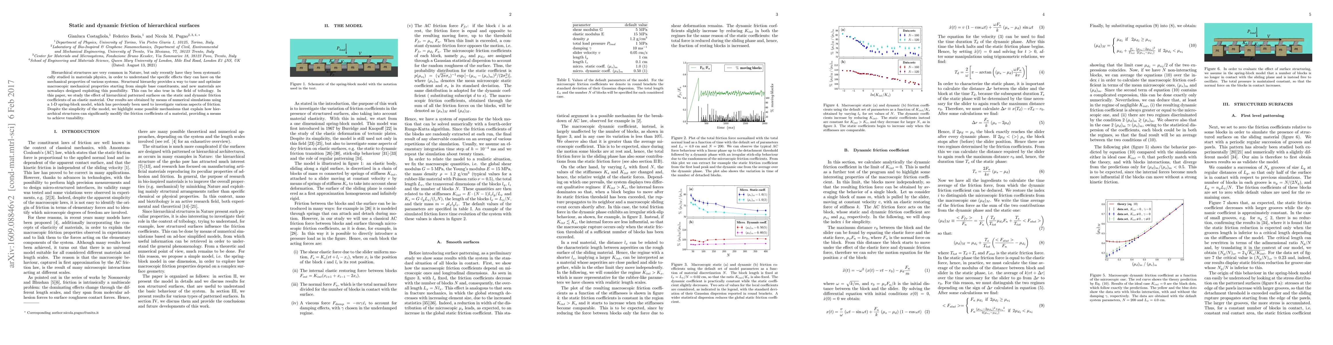 This paper explores how hierarchical surface patterns impact static and dynamic friction in elastic materials. Using a 1-D spring-block model, the study reveals that these structures can significantly alter friction coefficients, offering a way to tailor material properties.