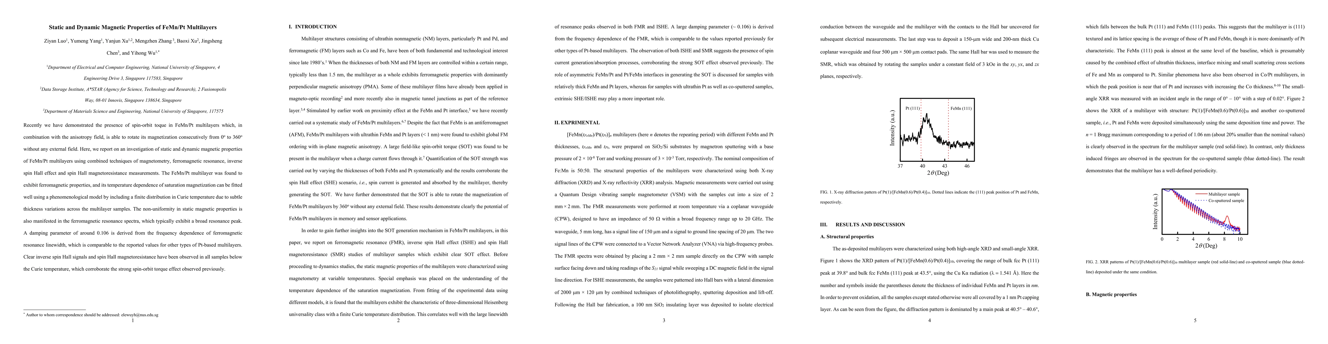 Recently we have demonstrated the presence of spin-orbit toque in FeMn/Pt multilayers which, in combination with the anisotropy field, is able to rotate its magnetization consecutively from 0o to 360o without any external field. Here, we report on an investigation of static and dynamic magnetic properties of FeMn/Pt multilayers using combined techniques of magnetometry, ferromagnetic resonance, inverse spin Hall effect and spin Hall magnetoresistance measurements. The FeMn/Pt multilayer was found to exhibit ferromagnetic properties, and its temperature dependence of saturation magnetization can be fitted well using a phenomenological model by including a finite distribution in Curie temperature due to subtle thickness variations across the multilayer samples. The non-uniformity in static magnetic properties is also manifested in the ferromagnetic resonance spectra, which typically exhibit a broad resonance peak. A damping parameter of around 0.106 is derived from the frequency dependence of ferromagnetic resonance linewidth, which is comparable to the reported values for other types of Pt-based multilayers. Clear inverse spin Hall signals and spin Hall magnetoresistance have been observed in all samples below the Curie temperature, which corroborate the strong spin-orbit torque effect observed previously.