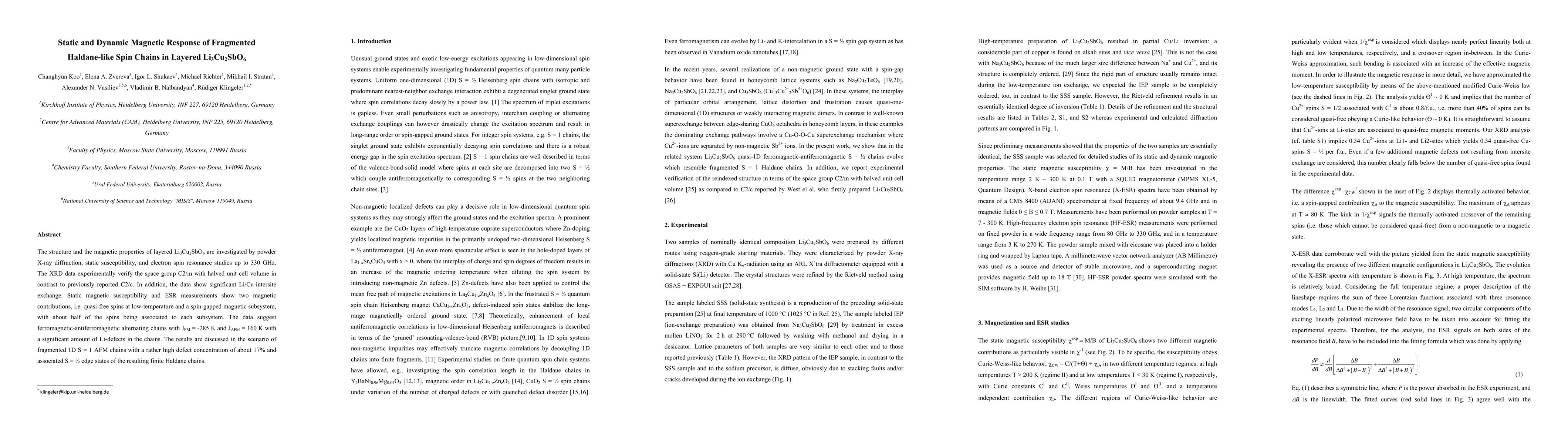 The structure and the magnetic properties of layered Li3Cu2SbO6 are investigated by powder X-ray diffraction, static susceptibility, and electron spin resonance studies up to 330 GHz. The XRD data experimentally verify the space group C2/m with halved unit cell volume in contrast to previously reported C2/c. In addition, the data show significant Li/Cu-intersite exchange. Static magnetic susceptibility and ESR measurements show two magnetic contributions, i.e. quasi-free spins at low-temperature and a spin-gapped magnetic subsystem, with about half of the spins being associated to each subsystem. The data suggest ferromagnetic-antiferromagnetic alternating chains with JFM = -285 K and JAFM = 160 K with a significant amount of Li-defects in the chains. The results are discussed in the scenario of fragmented 1D S = 1 AFM chains with a rather high defect concentration of about 17% and associated S = 1/2 edge states of the resulting finite Haldane chains.