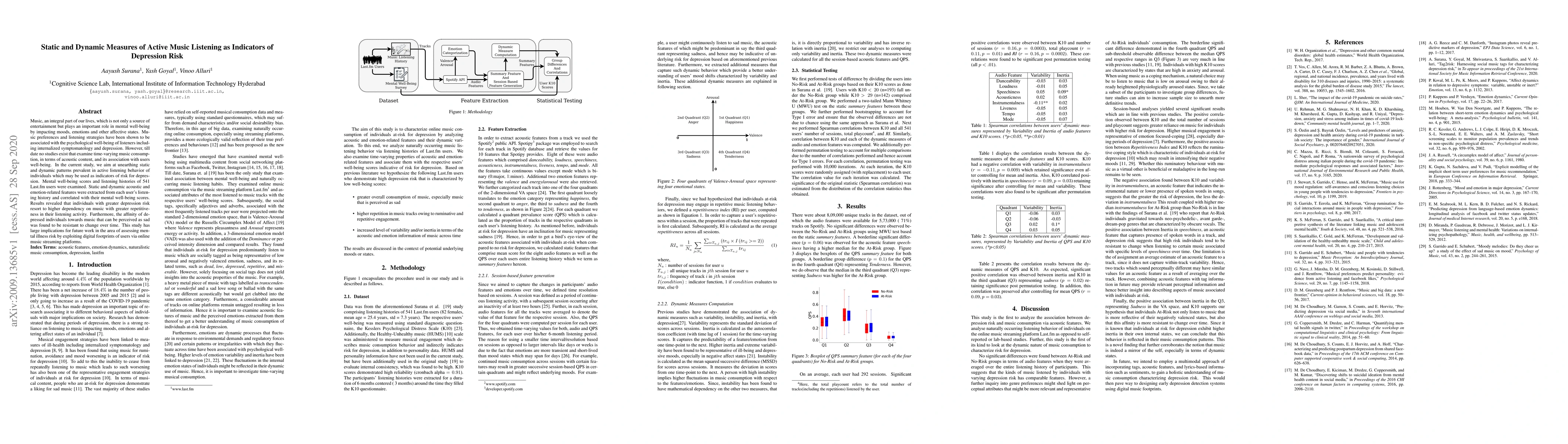This study investigates static and dynamic patterns in active music listening as potential indicators of depression risk, using Last.fm user data. Findings show that higher depression risk correlates with increased reliance on repetitive music and a persistent preference for sad-sounding music, suggesting these listening behaviors could predict mental health issues.