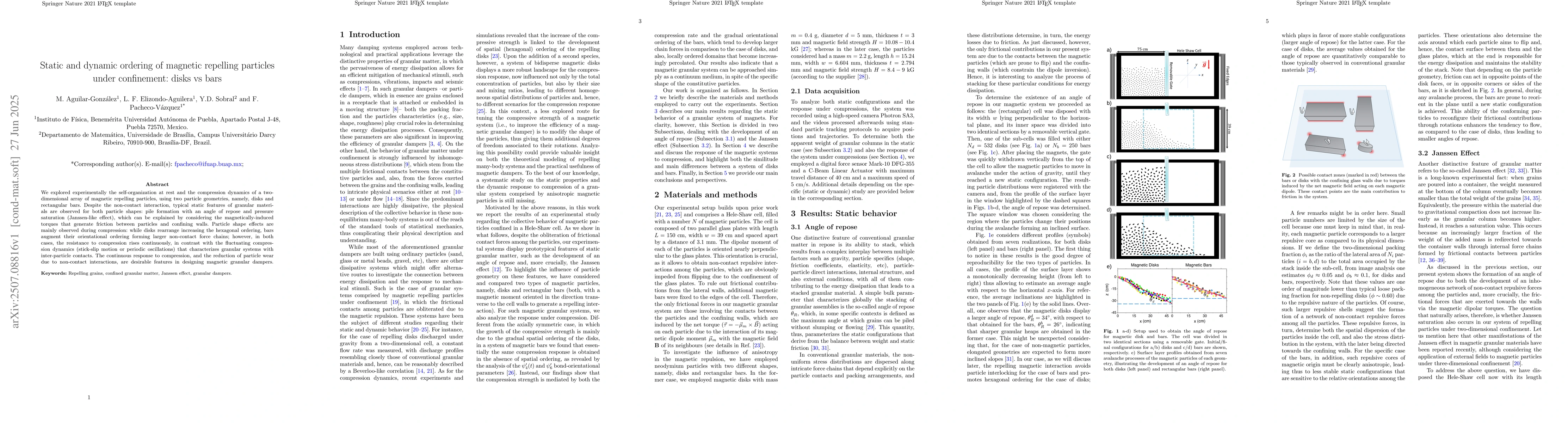 We explored experimentally the self-organization at rest and the compression dynamics of a two-dimensional array of magnetic repelling particles, using two particle geometries, namely, disks and rectangular bars. Despite the non-contact interaction, typical static features of granular materials are observed for both particle shapes: pile formation with an angle of repose and pressure saturation (Janssen-like effect), which can be explained by considering the magnetically-induced torques that generate friction between particles and confining walls. Particle shape effects are mainly observed during compression: while disks rearrange increasing the hexagonal ordering, bars augment their orientational ordering forming larger non-contact force chains; however, in both cases, the resistance to compression rises continuously, in contrast with the fluctuating compression dynamics (stick-slip motion or periodic oscillations) that characterizes granular systems with inter-particle contacts. The continuous response to compression, and the reduction of particle wear due to non-contact interactions, are desirable features in designing magnetic granular dampers.