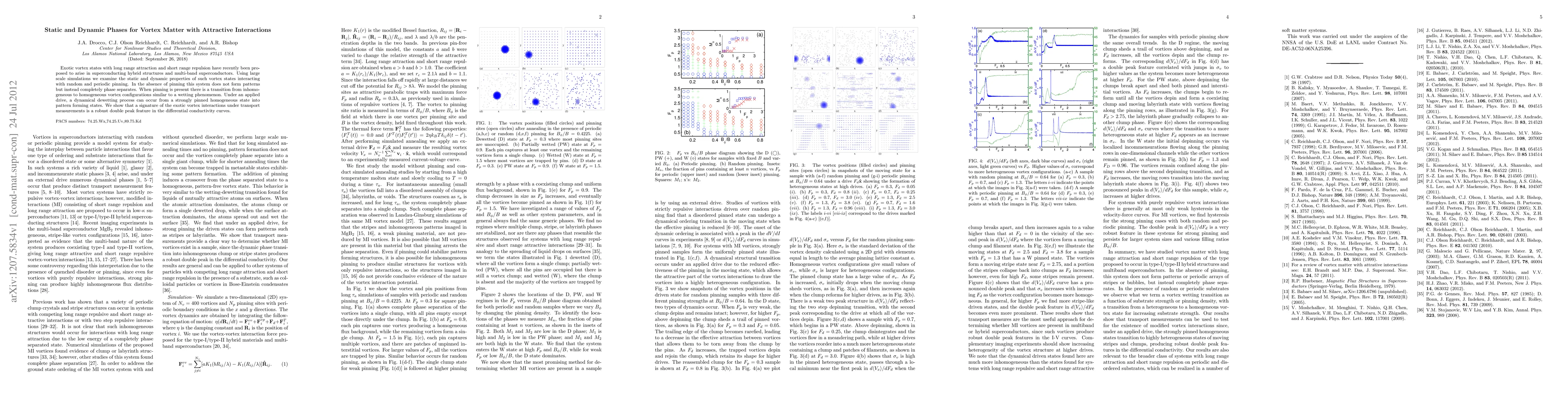 Exotic vortex states with long range attraction and short range repulsion have recently been proposed to arise in superconducting hybrid structures and multi-band superconductors. Using large scale simulations we examine the static and dynamic properties of such vortex states interacting with random and periodic pinning. In the absence of pinning this system does not form patterns but instead completely phase separates. When pinning is present there is a transition from inhomogeneous to homogeneous vortex configurations similar to a wetting phenomenon. Under an applied drive, a dynamical dewetting process can occur from a strongly pinned homogeneous state into pattern forming states. We show that a signature of the exotic vortex interactions under transport measurements is a robust double peak feature in the differential conductivity curves.