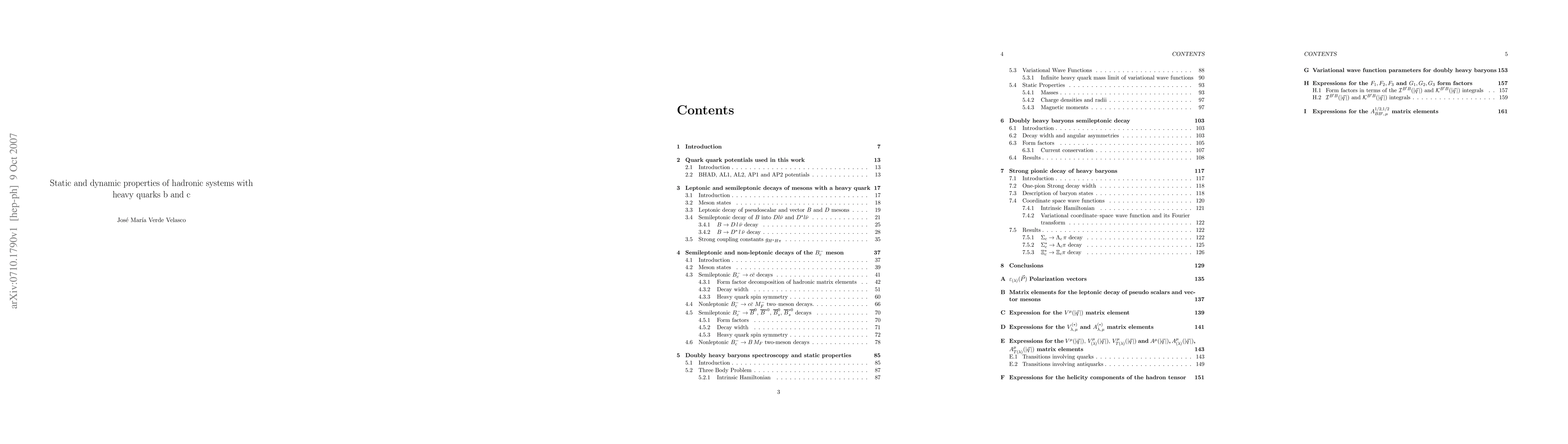 This thesis has been devoted to the study of different properties of hadrons with one and two heavy quarks $c$ and/or $b$. All calculations have been done in the framework of a nonrelativistic constituent quark model. In order to check the sensitivity of our results to the inter--quark interaction we have used five different quark--quark potentials. The spread in results gives an estimation of theoretical uncertainties and so has been quoted. Most observables studied change only at the level of a few per cent when changing the interaction potential. Another source of theoretical uncertainty is the use of nonrelativistic kinematics in the evaluation of the orbital wave functions and the construction of our nonrelativistic states, although we think that a good part of these relativistic effects are contained in an effective way in the parameters of the quark-quark potentials, which were adjusted in the original works to reproduce the experimental spectra of mesons. Mesons wave functions have been evaluated using a Numerov algorithm, while for baryons the three body problem has been solved using a variational approach with ansatz wave functions that include simplifications that arise from HQS and HQSS. To compute hadron decays we have relied on the impulse approximation, which induces small axial and vector current conservation violations due to binding effects. These binding effects, though they affect some of the weak form factors analyzed, have little influence on the decay widths.