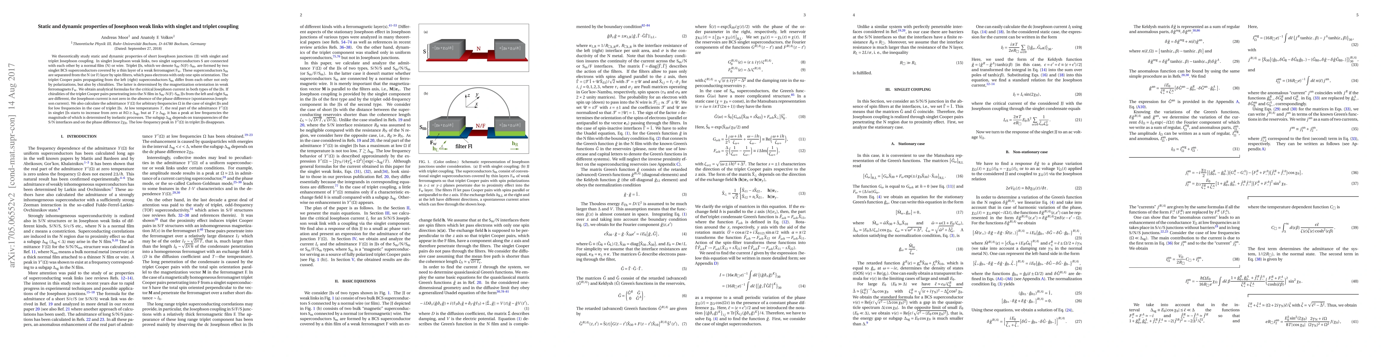We theoretically study static and dynamic properties of short Josephson junctions (JJ) with singlet and triplet Josephson coupling. In singlet Josephson weak links, two singlet superconductors S are connected with each other by a normal film (N) or wire. Triplet JJs, which we denote S$_{\text{m}}$/N(F)/S$_{\text{m}}$, are formed by two singlet BCS superconductors covered by a thin layer of a weak ferromagnet F$_{\text{w}}$. These superconductors S$_{\text{m}}$ are separated from the N (or F) layer by spin filters, which pass electrons with only one spin orientation. The triplet Cooper pairs propagating from the left (right) superconductors S$_{\text{m}}$ differ from each other not only by polarizations, but also by chiralities. The latter is determined by the magnetization orientation in weak ferromagnets F$_{\text{w}}$. We obtain analytical formulas for the critical Josephson current in both types of the JJs. If chiralities of the triplet Cooper pairs penetrating into the N film in S$_{\text{m}}$/N(F)/S$_{\text{m}}$ JJs from the left and right S$_{\text{m}}$ are different, the Josephson current is not zero in the absence of the phase difference (spontaneous Josephson current). We also calculate the admittance $Y(\Omega)$ for arbitrary frequencies $\Omega$ in the case of singlet JJs and for low frequencies in the case of triplet JJs. At low temperatures $T$, the real part of the admittance $Y^{\prime}(\Omega)$ in singlet JJs starts to increase from zero at ${\hbar \Omega \geq \Delta_{\text{sg}}}$, but at ${T \geq \Delta_{\text{sg}}}$, it has a peak at low frequencies the magnitude of which is determined by inelastic processes. The subgap $\Delta_{\text{sg}}$ depends on transparencies of the S/N interfaces and on the phase difference $2 \chi_{0}$. The low-frequency peak in $Y^{\prime}(\Omega)$ in triplet JJs disappears.