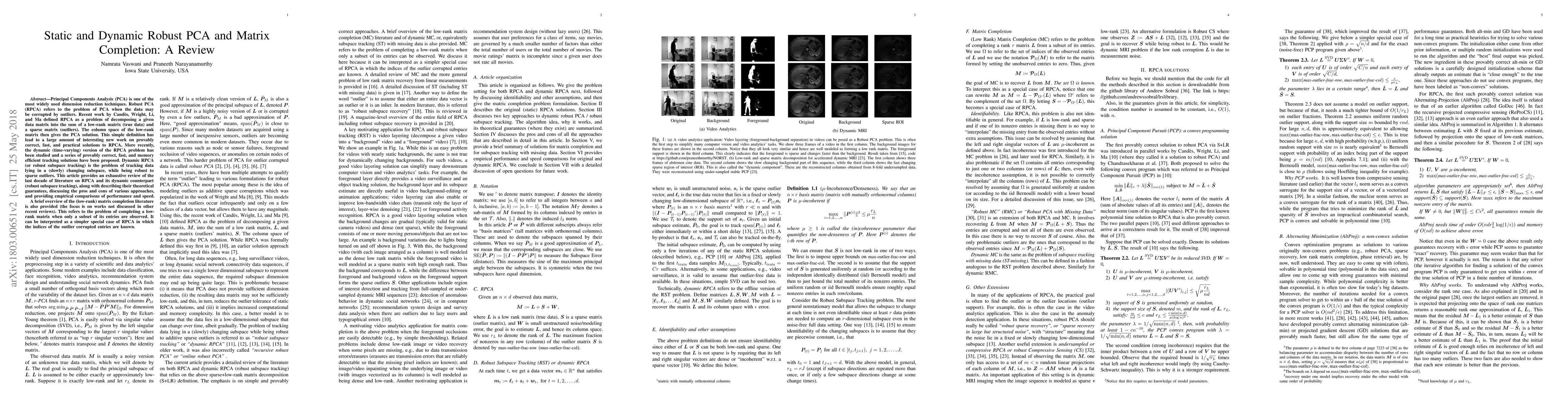 This paper reviews advancements in Robust PCA (RPCA) and its dynamic version, focusing on methods for decomposing matrices into low-rank and sparse components, and tracking these changes over time. It also covers matrix completion, highlighting theoretical guarantees, performance comparisons, and practical implications of various approaches.