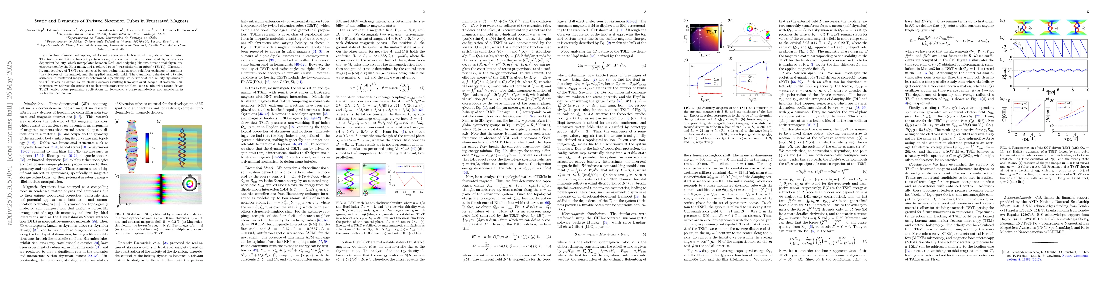 This work introduces and analyzes twisted skyrmion tubes (TSkTs) in frustrated magnets, distinguishing it by demonstrating their stability, topology, and dynamical behavior under electric current, along with potential applications in low-power storage nanodevices.