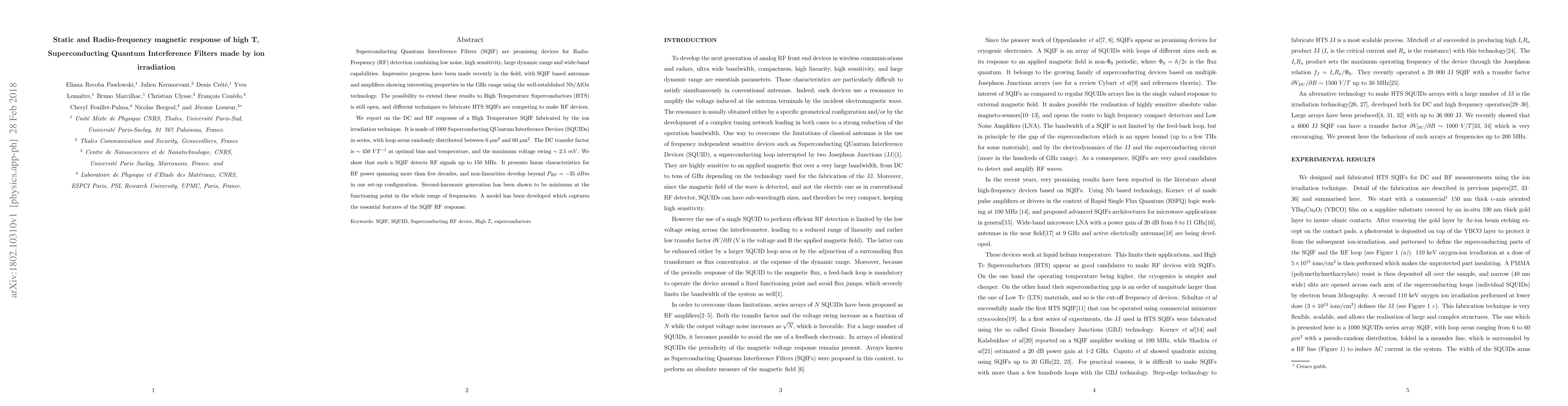 This paper investigates the static and radio-frequency (RF) magnetic response of high-temperature superconducting quantum interference filters (SQIF) fabricated via ion irradiation. The results show a DC transfer factor of 450 V/T and RF detection up to 150 MHz, with linear characteristics over a wide RF power range.