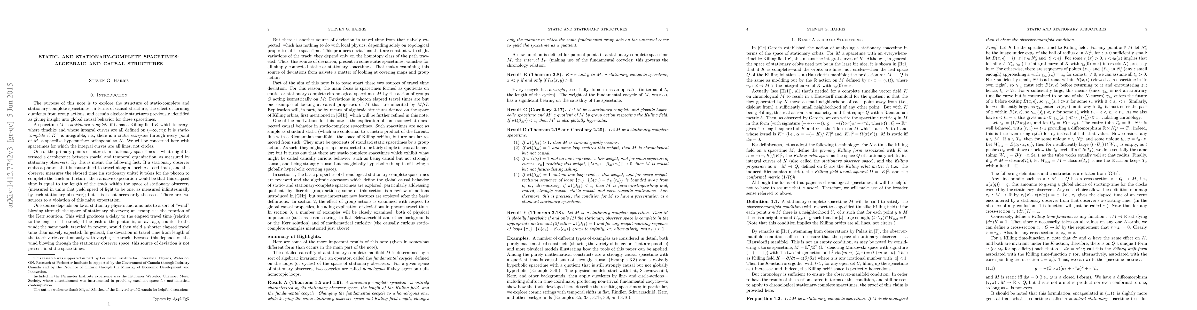 This is intended as an analysis of the global properties of static and stationary spacetimes with complete (timelike) Killing field, with particular attention to quotients by group actions. This is presented in terms of algebraic structures which are fairly simple for the static case and more involved for the stationary case; the most important tool, the fundamental cocycle, is a cohomological class for static spacetimes but of somewhat looser structure in the stationary case. In particular: (1) A new measurement, similar to the spacetime interval in Minkowski space, is devised for detecting whether two points are causally related in a stationary spacetime; this proves very useful for analysis. (2) All stationary spacetimes are categorized by how they behave with respect to the fundamental cocycle; this enables a complete characterization of global causality properties. (3) It is shown how these tools determine whether global hyperbolicity of a stationary spacetime is inherited by its quotients. (4) Examples are examined in detail, a large range including both ones of mathematical curiosity and ones of physical interest, such as cosmic strings in flat, accelerated, Schwarzschild, Kerr, and other backgrounds.