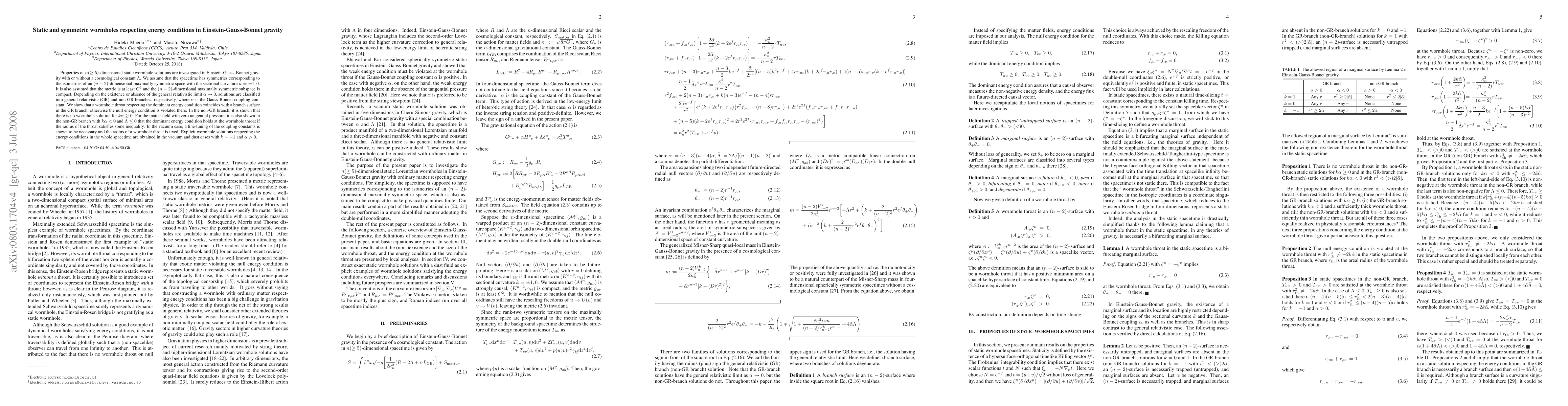 Properties of $n(\ge 5)$-dimensional static wormhole solutions are investigated in Einstein-Gauss-Bonnet gravity with or without a cosmological constant $\Lambda$. We assume that the spacetime has symmetries corresponding to the isometries of an $(n-2)$-dimensional maximally symmetric space with the sectional curvature $k=\pm 1, 0$. It is also assumed that the metric is at least $C^{2}$ and the $(n-2)$-dimensional maximally symmetric subspace is compact. Depending on the existence or absence of the general relativistic limit $\alpha \to 0$, solutions are classified into general relativistic (GR) and non-GR branches, respectively, where $\alpha$ is the Gauss-Bonnet coupling constant. We show that a wormhole throat respecting the dominant energy condition coincides with a branch surface in the GR branch, otherwise the null energy condition is violated there. In the non-GR branch, it is shown that there is no wormhole solution for $k\alpha \ge 0$. For the matter field with zero tangential pressure, it is also shown in the non-GR branch with $k\alpha<0$ and $\Lambda \le 0$ that the dominant energy condition holds at the wormhole throat if the radius of the throat satisfies some inequality. In the vacuum case, a fine-tuning of the coupling constants is shown to be necessary and the radius of a wormhole throat is fixed. Explicit wormhole solutions respecting the energy conditions in the whole spacetime are obtained in the vacuum and dust cases with $k=-1$ and $\alpha>0$.