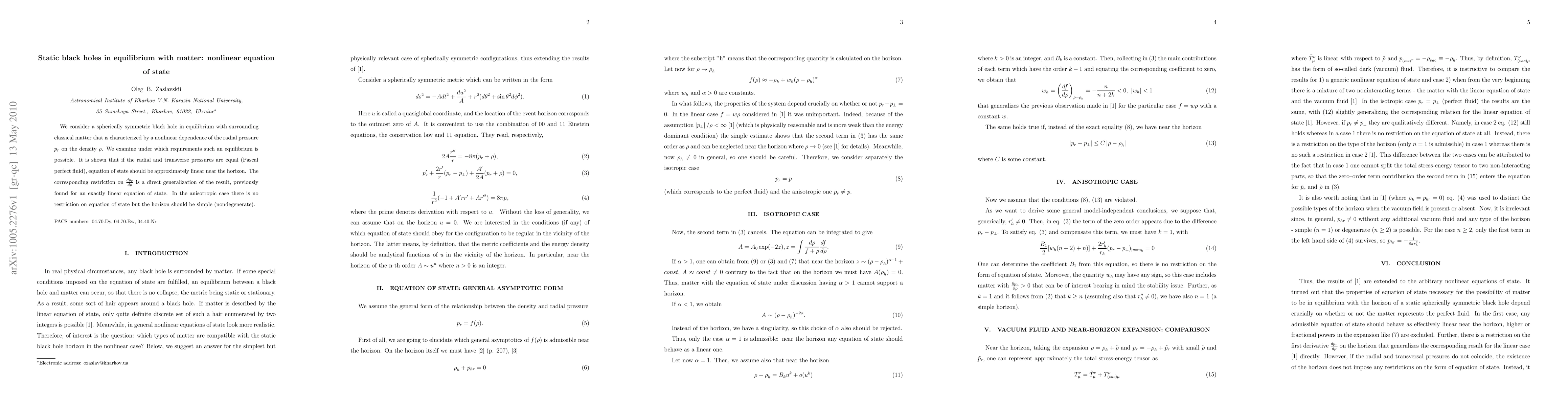 We consider a spherically symmetric black hole in equilibrium with surrounding classical matter that is characterized by a nonlinear dependence of the radial pressure p_{r} on the density {\rho}. We examine under which requirements such an equilibrium is possible. It is shown that if the radial and transverse pressures are equal (Pascal perfect fluid), equation of state should be approximately linear near the horizon. The corresponding restriction on ((dp_{r})/(d{\rho})) is a direct generalization of the result, previously found for an exactly linear equation of state. In the anisotropic case there is no restriction on equation of state but the horizon should be simple (nondegenerate).