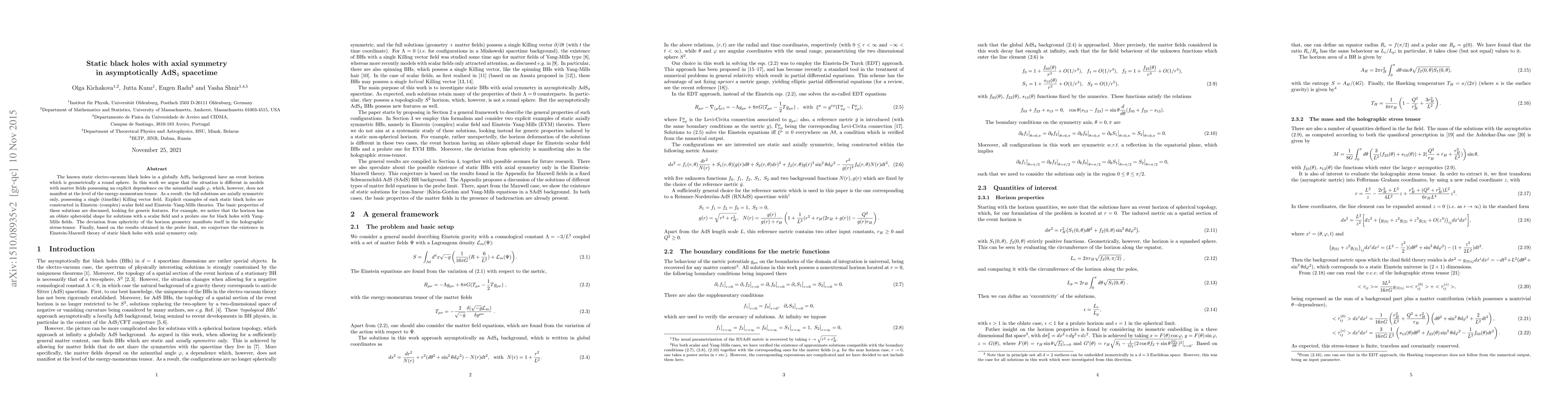 The known static electro-vacuum black holes in a globally AdS$_4$ background have an event horizon which is geometrically a round sphere. In this work we argue that the situation is different in models with matter fields possessing an explicit dependence on the azimuthal angle $\varphi$, which, however, does not manifest at the level of the energy-momentum tensor. As a result, the full solutions are axially symmetric only, possessing a single (timelike) Killing vector field. Explicit examples of such static black holes are constructed in Einstein--(complex) scalar field and Einstein--Yang-Mills theories. The basic properties of these solutions are discussed, looking for generic features. For example, we notice that the horizon has an oblate spheroidal shape for solutions with a scalar field and a prolate one for black holes with Yang-Mills fields. The deviation from sphericity of the horizon geometry manifests itself in the holographic stress-tensor. Finally, based on the results obtained in the probe limit, we conjecture the existence in the Einstein-Maxwell theory of static black holes with axial symmetry only.
