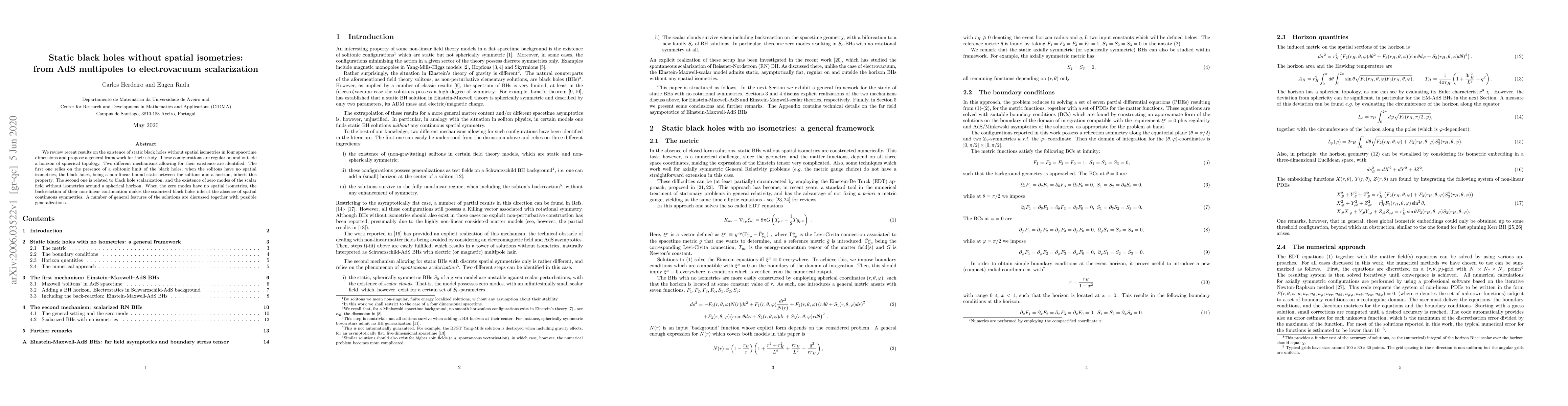 This paper reviews static black holes in four dimensions lacking spatial isometries, proposing a framework for their study. It identifies two mechanisms: solitonic limits and black hole scalarization, both leading to configurations without continuous spatial symmetries.